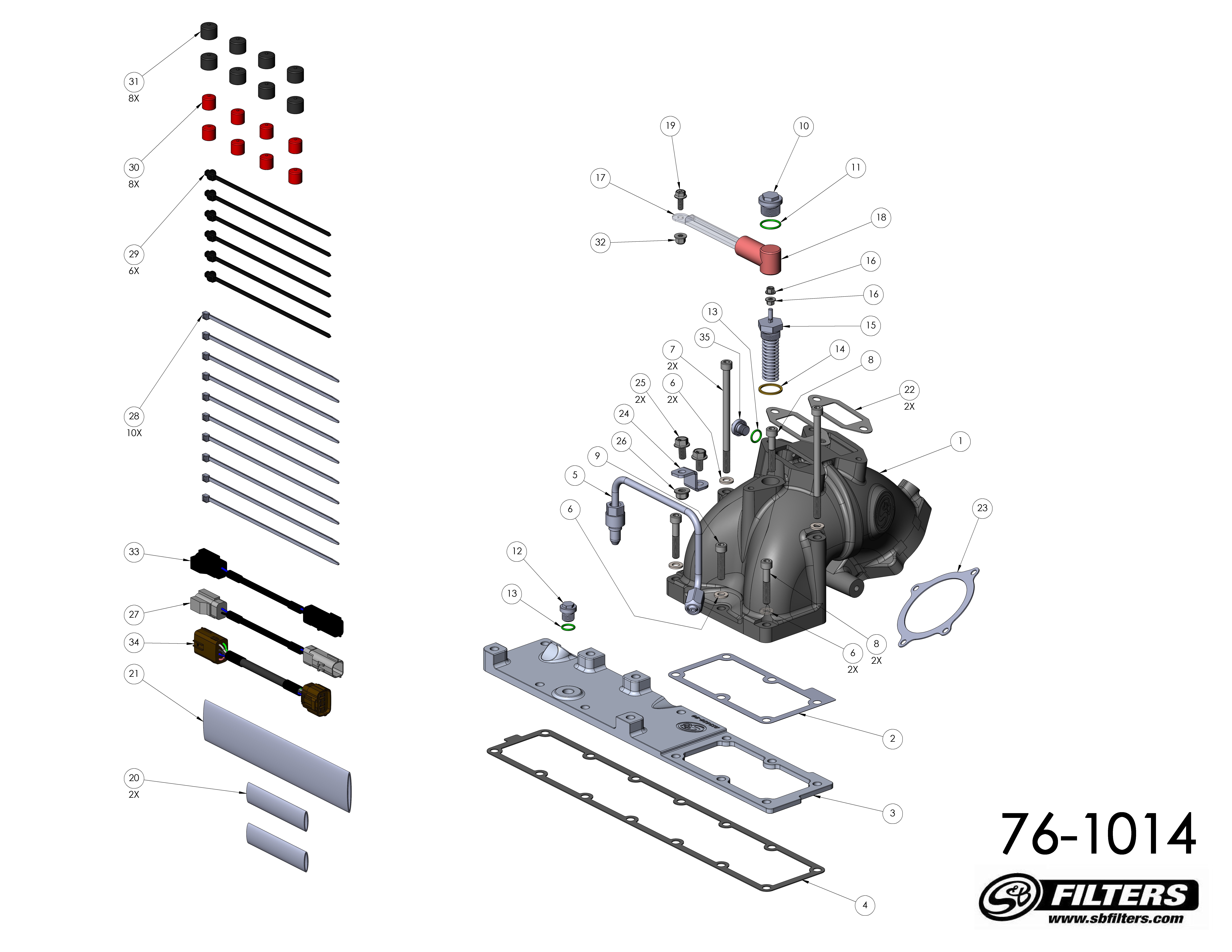 For 2010-2018 model years, the temperature sensor is located on the EGR crossover tube. Examine the EGR temperature sensor wire harness connector to see what color it is. If the stock connector is grey, (2012-2018 model years) you will be using the Extension Harness with the grey connector (Item 27). If the stock connector is black (2010-2011 model years), you will be using the Extension Harness with the black connector (Item 33).