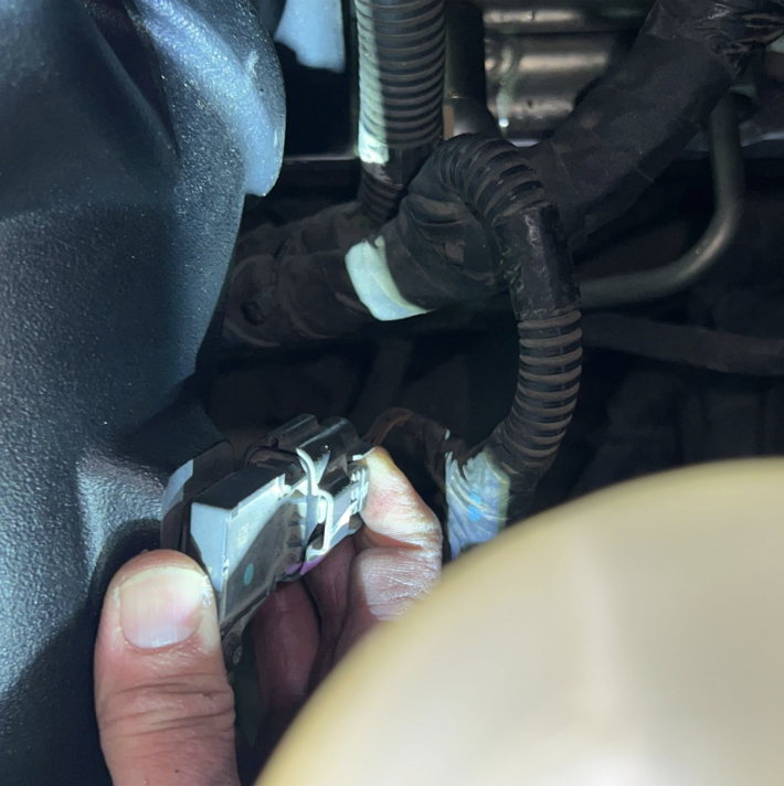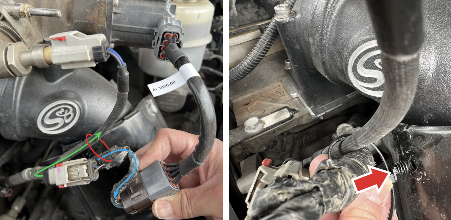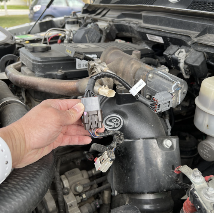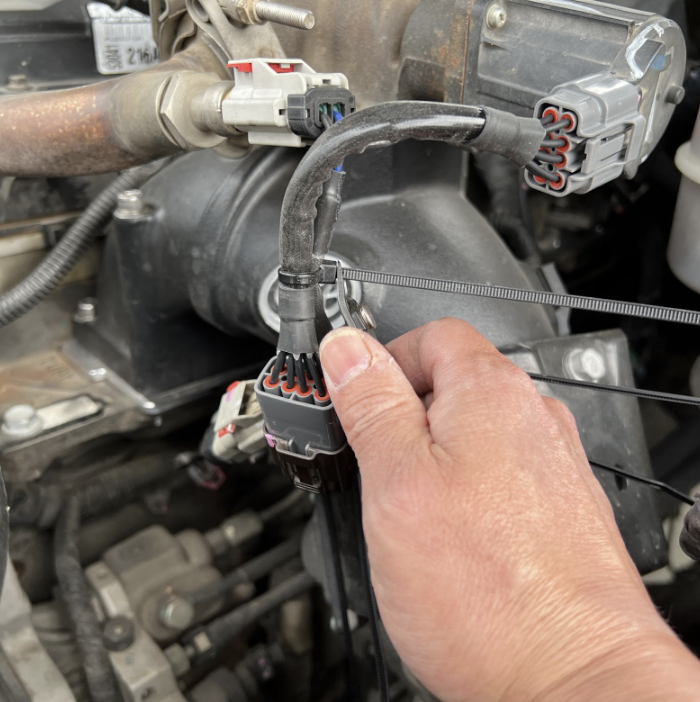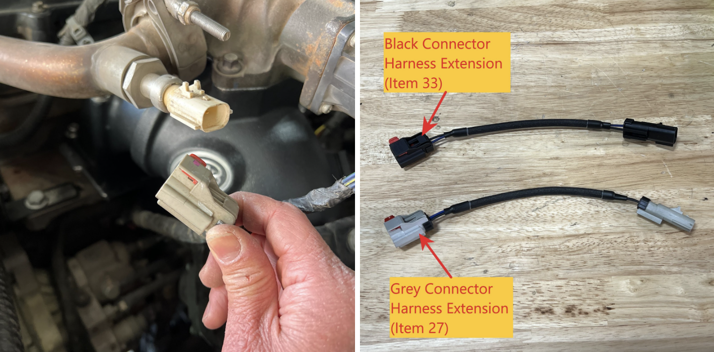 Attach the other end of the EGR Valve Extension Harness (Item 34) to the stock EGR wire harness. Fully insert the connector until the retaining tab “clicks” into place.