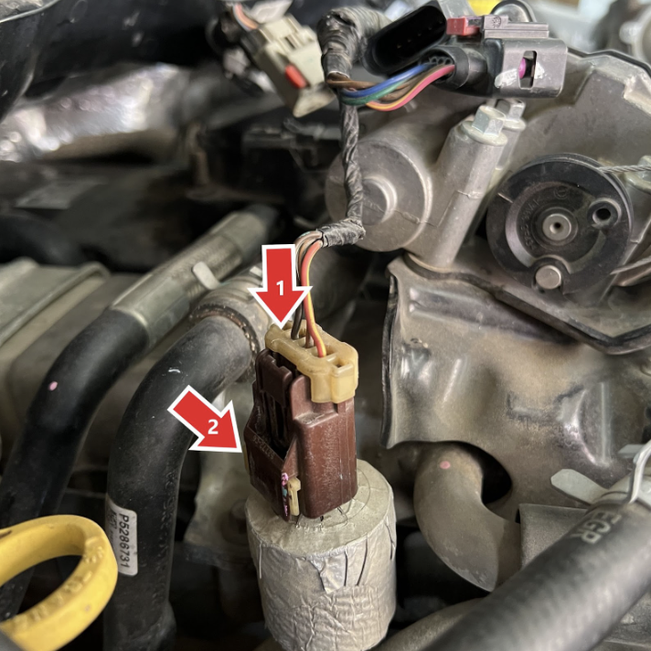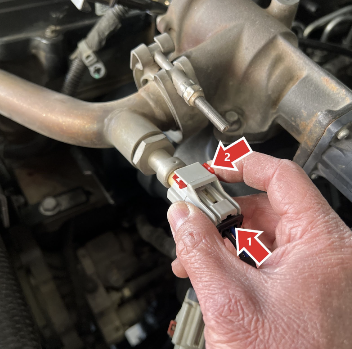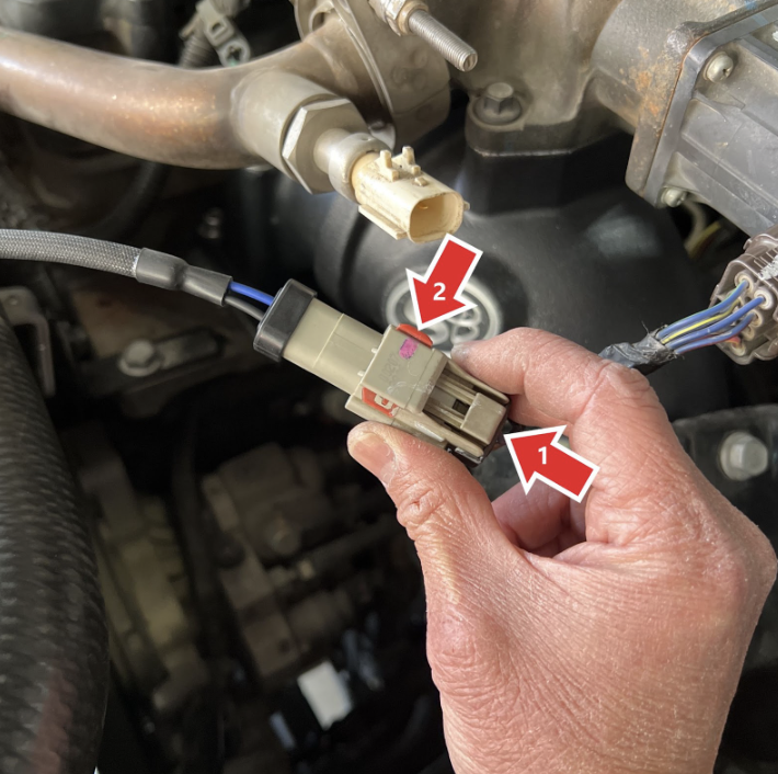 For 2010-2018 model years, connect the Extension Harness connector to the EGR temperature sensor on the crossover tube. To connect the harness connector, first slide the connector fully on to the sensor until the retaining tab “clicks” into place. Then slide the red locking clip in the direction shown until it locks into position.