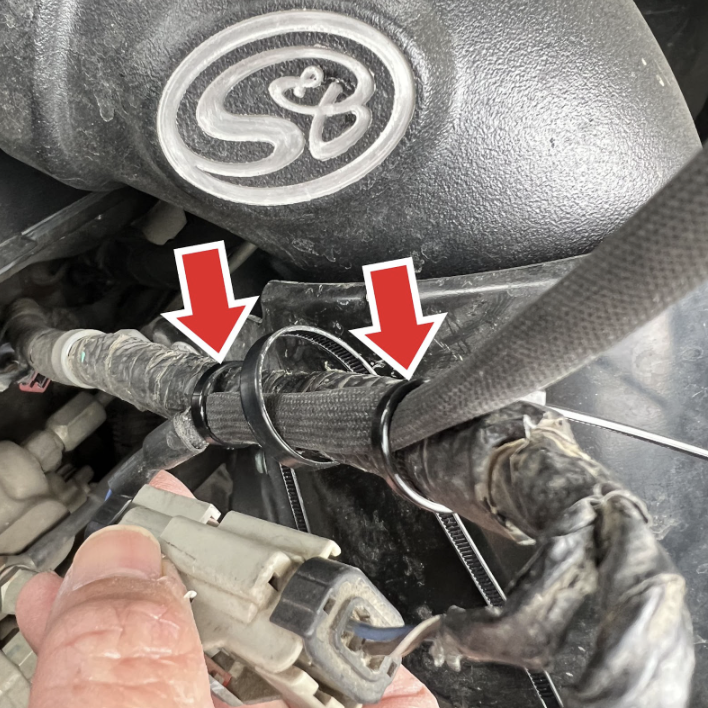 Re-attach both CCV oil drain hoses located on the driver side of the crankcase breather cover. Carefully use a Panel Popper to push the end of the drain hose into the hose barb. Make sure the CCV oil drain hose next to the Intake Elbow is not being pinched by the Intake Elbow or fuel rail return line.