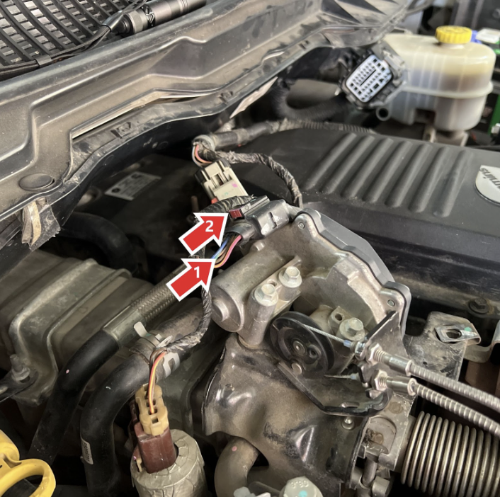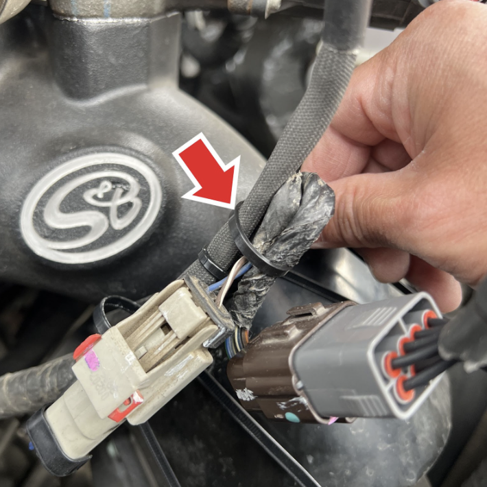 Connect both fuel injector wire harness connectors located on the driver side of the crankcase breather cover. To connect the harness connector, slide the connector fully into the housing until the retaining tab “clicks” into place.