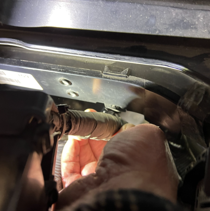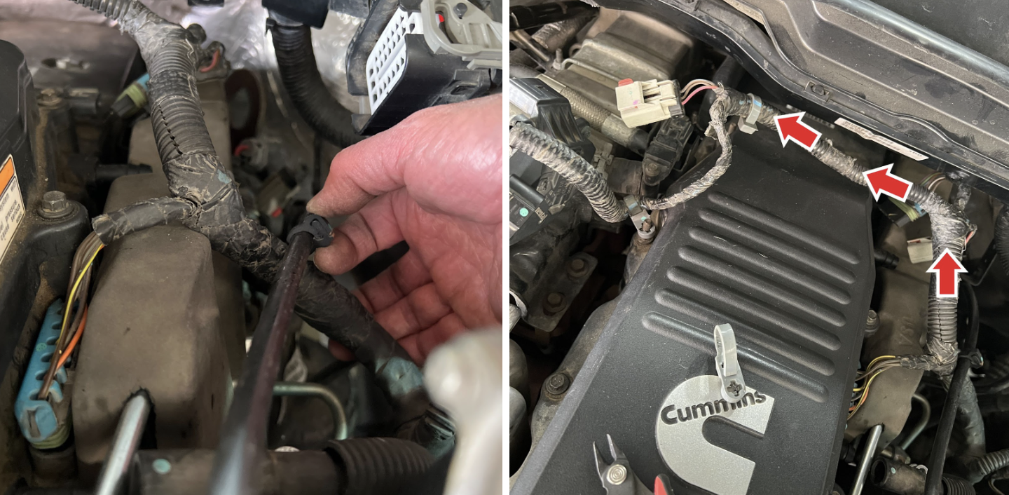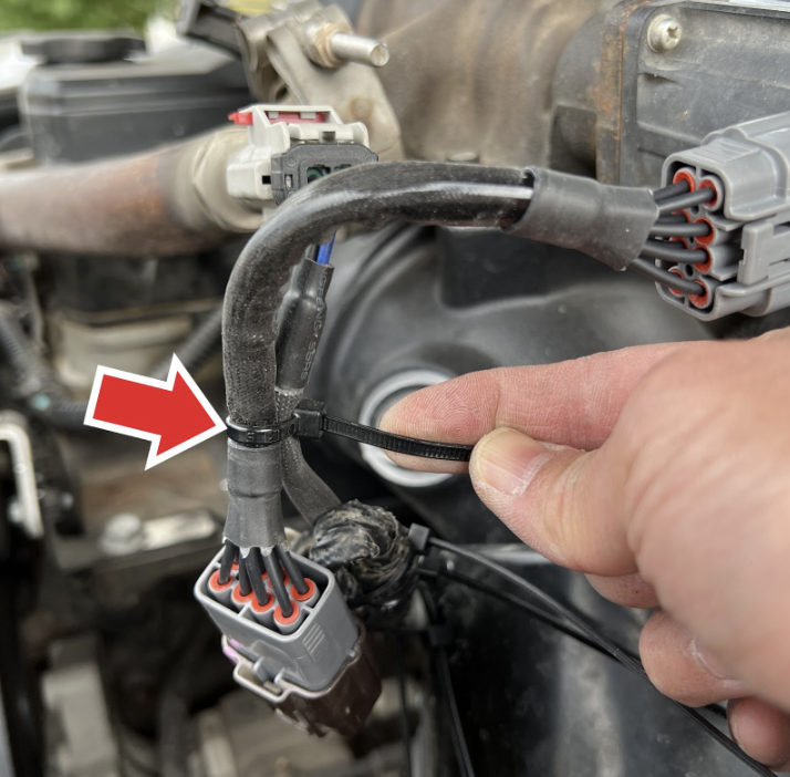 For 2010-2018 model years, use (2) Cable (Zip) Ties (Item 28) on both sides of the Push In Cable Tie to fasten the Temp Sensor Extension Harness to the stock harness as shown. Tighten the (2) Cable (Zip) Ties and leave the center Push In Cable Tie loose at this time.