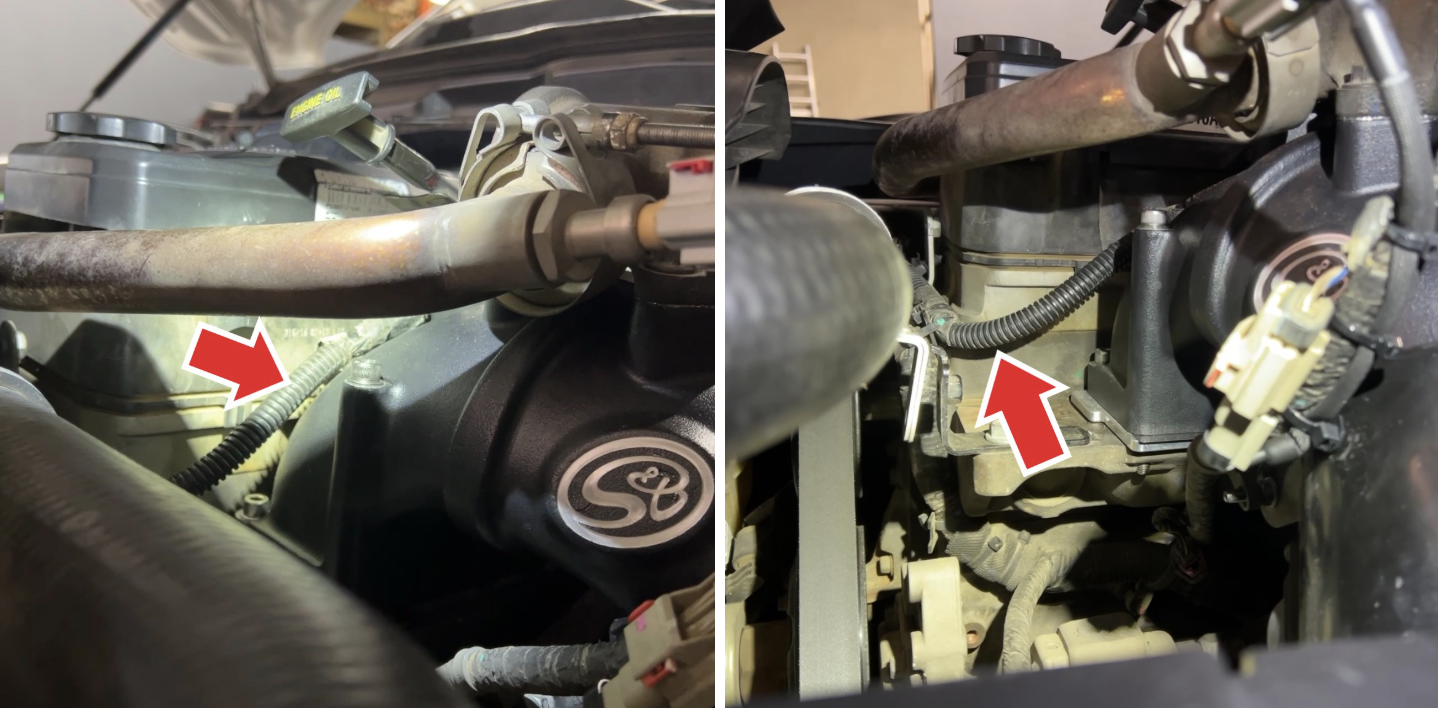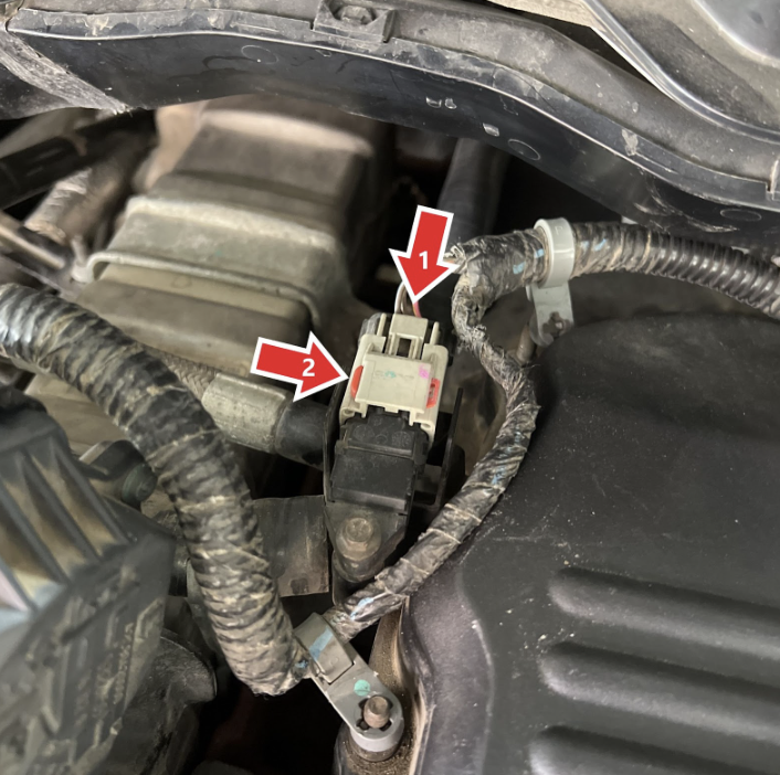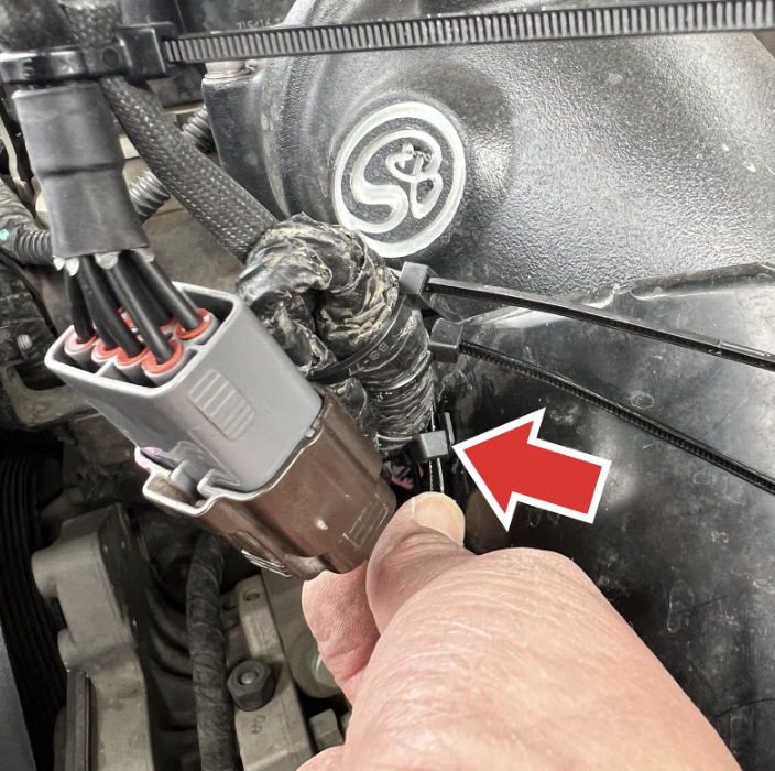 For 2007-2009 model years, the temperature sensor is located on the back of the Elbow as installed in Step 87A. Re-connect the temperature sensor connector to the stock wire harness. To connect the sensor connector, first slide the connector fully into the stock connector until the retaining tab “clicks” into place. Then slide the red locking clip to lock it in place.