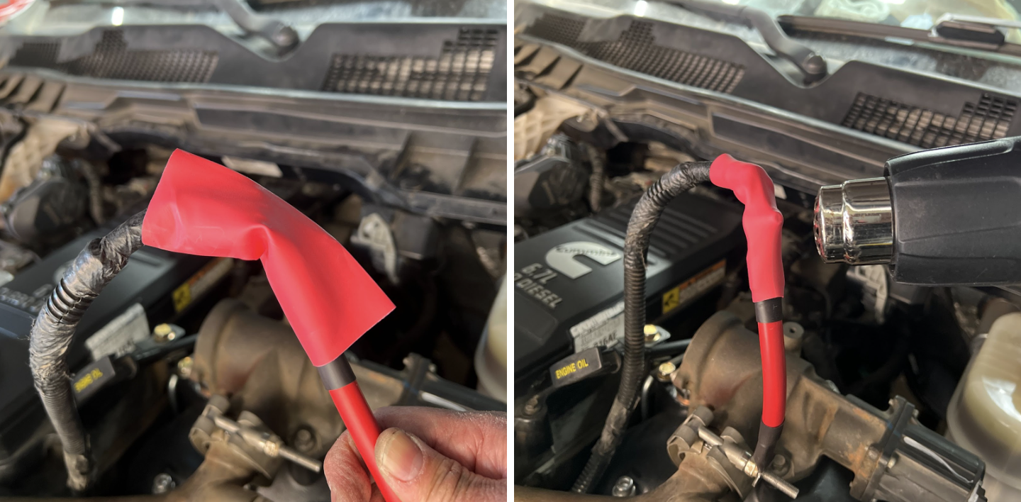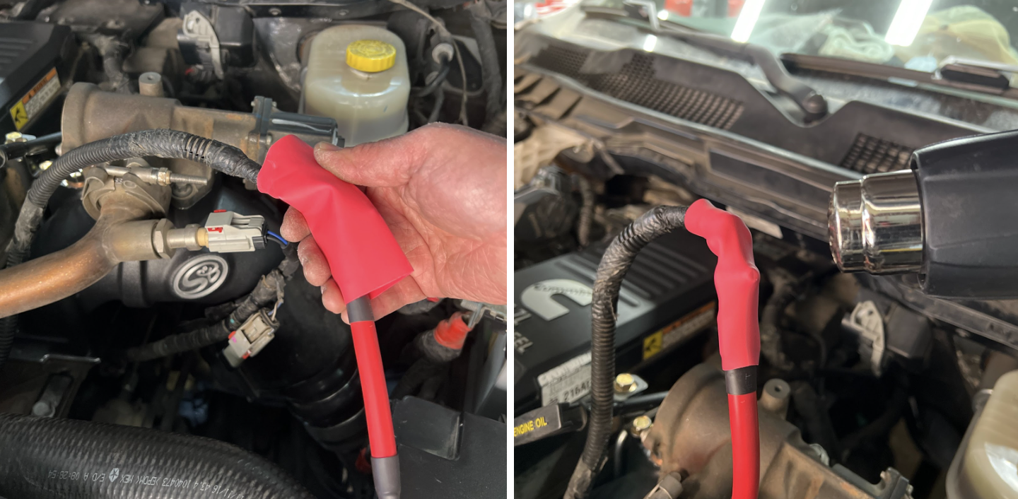 Slide the Heat Shrink (Item 20) over the exposed metal contact of the Extension Cable and stock heater grid cable, then shrink the Heat Shrink with a Heat Gun. Make sure there is no exposed metal or tears after shrinking the Heat Shrink.