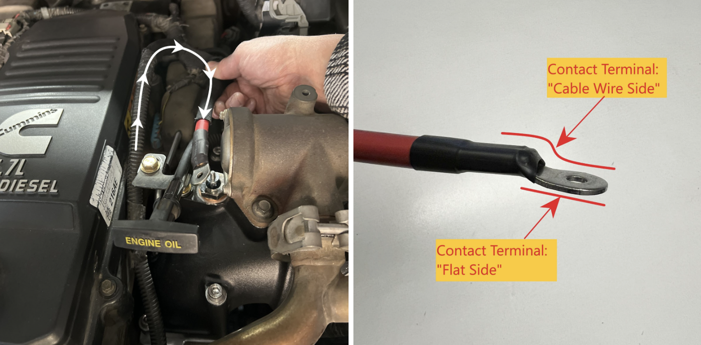Route the extended grid heater cable to travel down the side of the cylinder head and wrap around back towards the Air Intake Heater as shown. Make sure to arrange the contact terminal (of the Extension Cable, Item 17) so that the “flat side” of the contact terminal will face down towards the Intake Air Heater and the “cable wire side” of the contact terminal will face upwards away from the Intake Air Heater as shown.
