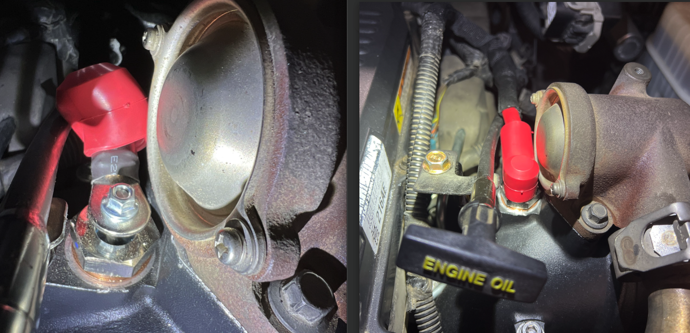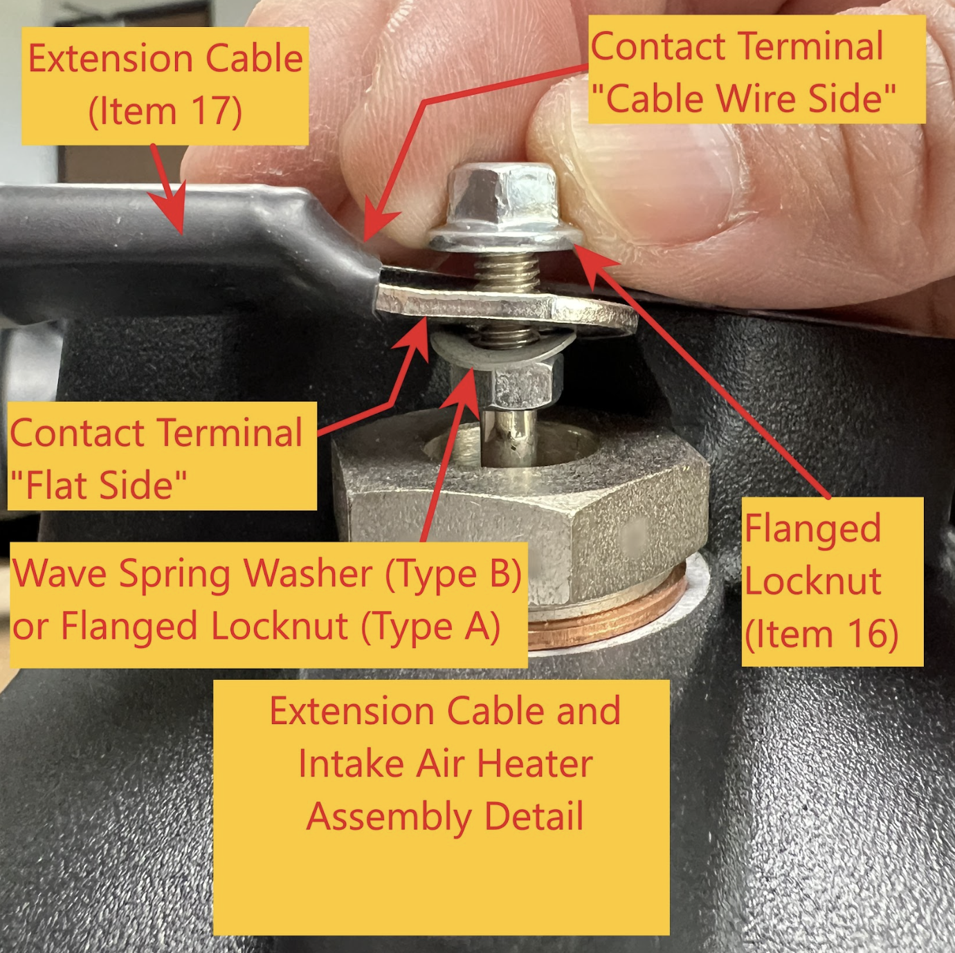 Place the Extension Cable (Item 17) contact terminal so that the threaded stud of the Intake Air Heater goes through the contact terminal hole. Make sure to place the “flat side” of the terminal facing down towards the Intake Air Heater and the “cable wire side” of the terminal facing upwards as shown. Use an M5 Flanged Locknut (Item 16) on top of the grid heater contact terminal and hand tight at this time. Make sure that the contact terminal is only touching the threaded stud of the Intake Air Heater so that it will not cause any electrical shorts.