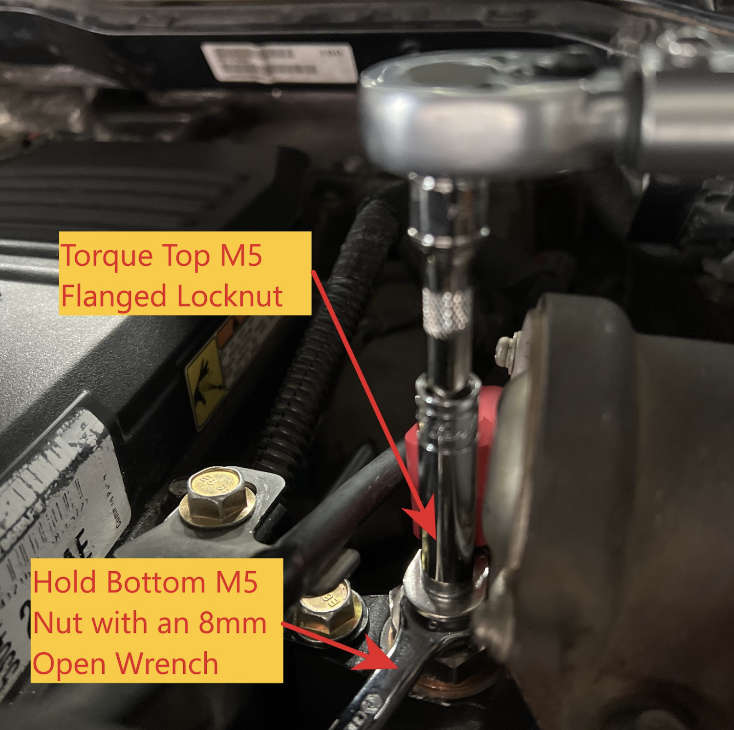 Hold the bottom M5 nut with an 8mm open wrench to prevent the threaded stud from rotating and possibly twisting or breaking as you torque down the top M5 Flanged Locknut.Then torque the top M5 Flanged Locknut on the Intake Air Heater threaded stud to 35 lb-in.