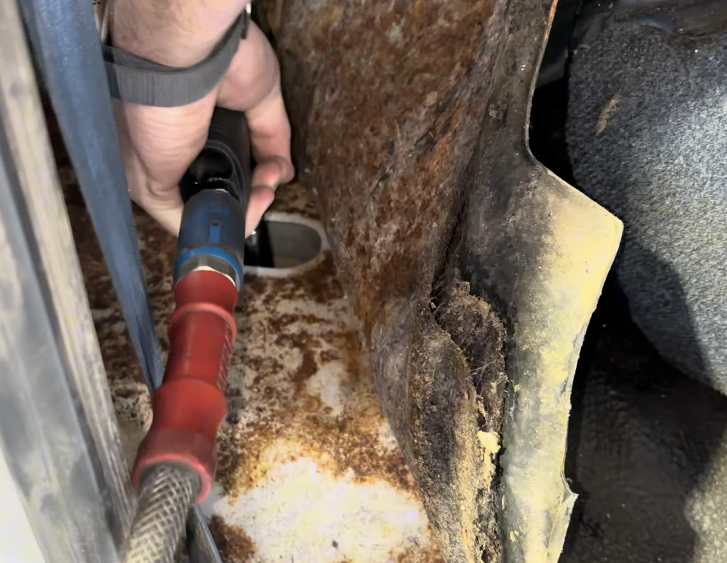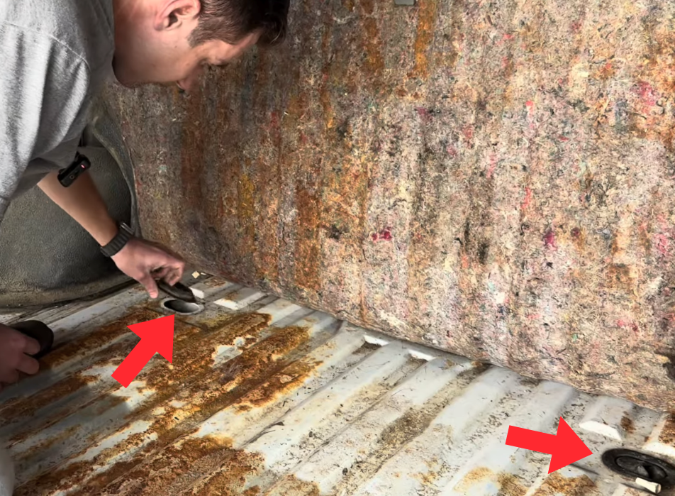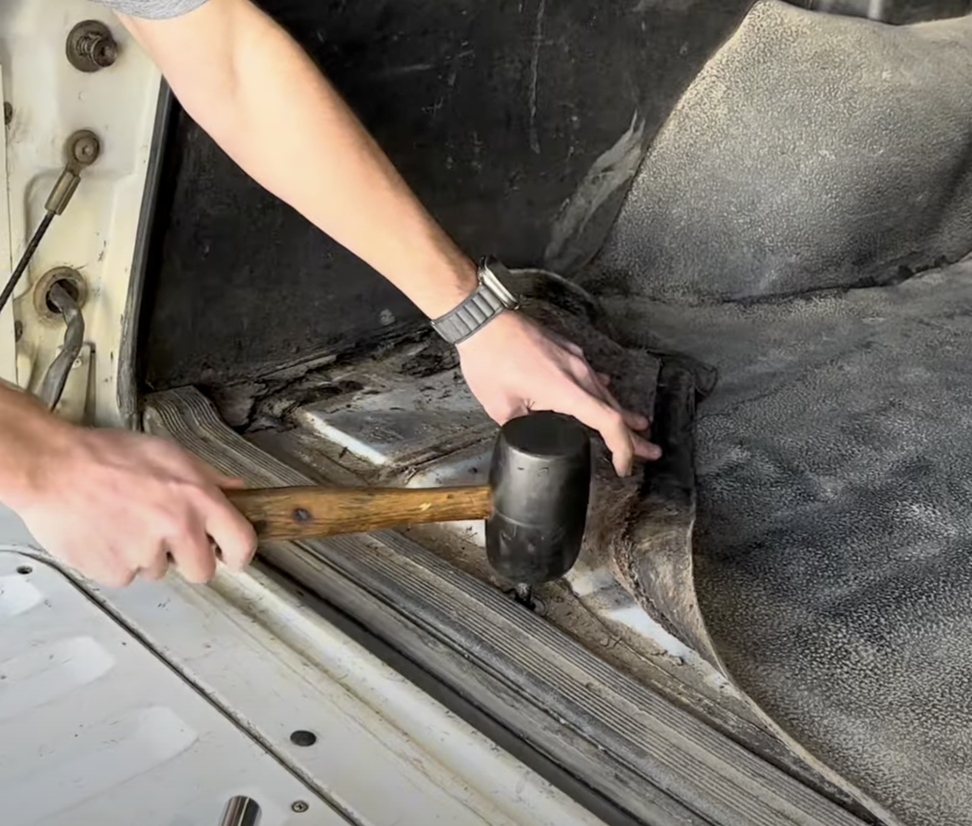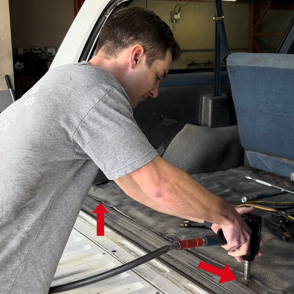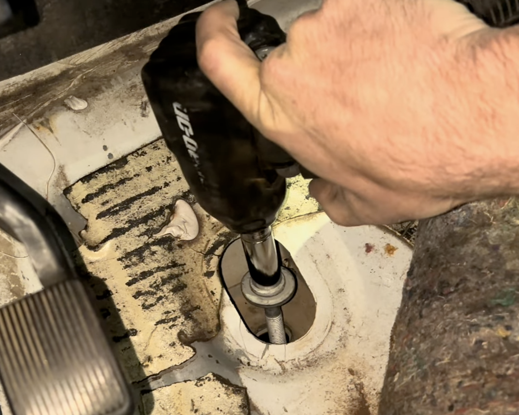 Lift up the rear mat/carpet in order to gain access to the 4th row of body mounts. Then, using a 5/16th socket remove the (2) body mount bolts.