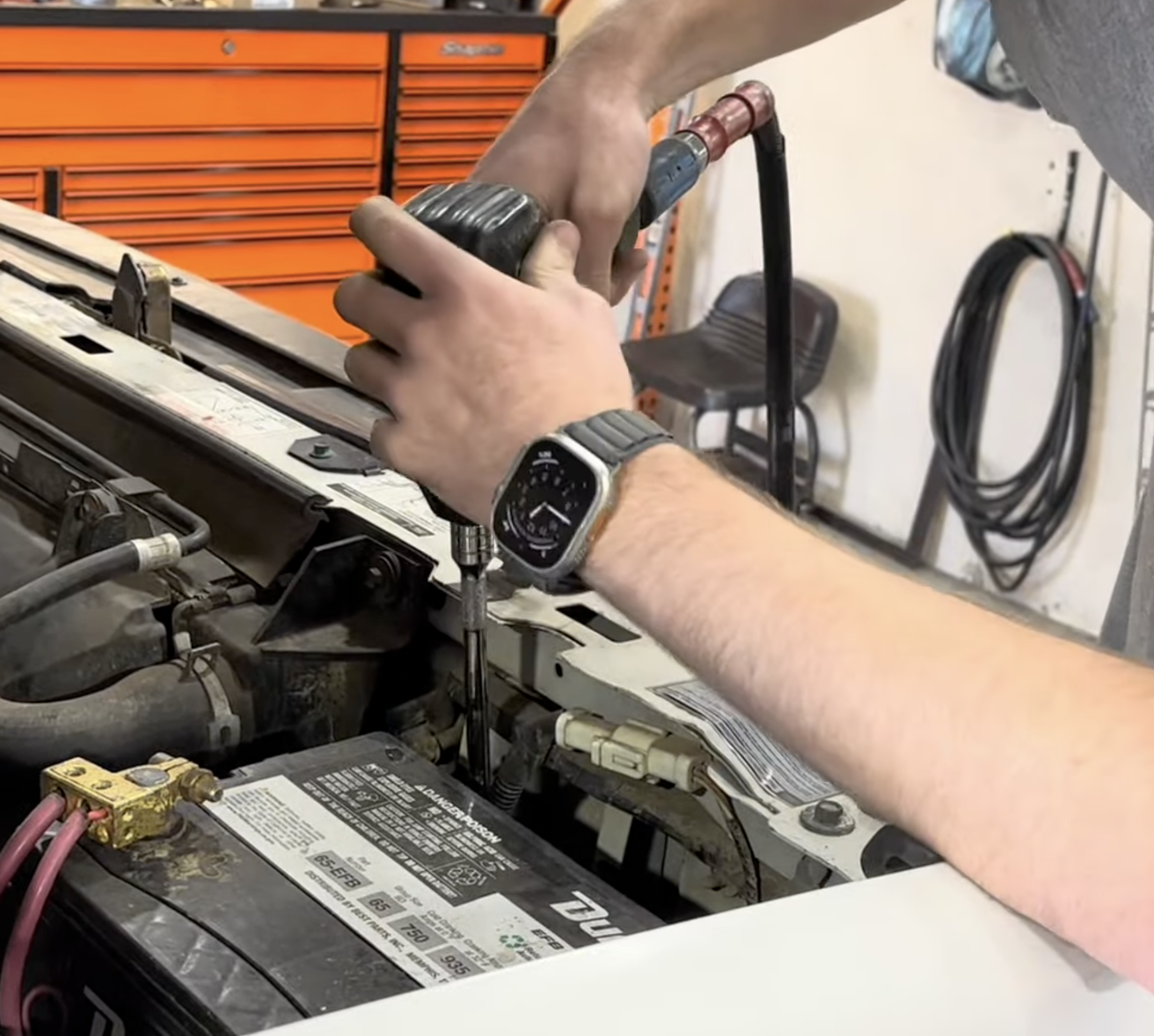 While still at the front core support body mounts, once you've removed the top nut, go ahead and unbolt the factory bolts from underneath using a 5/8th socket.