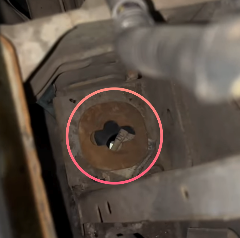 Lift up the front portion of the carpet to gain access. Then remove the plastic plug.