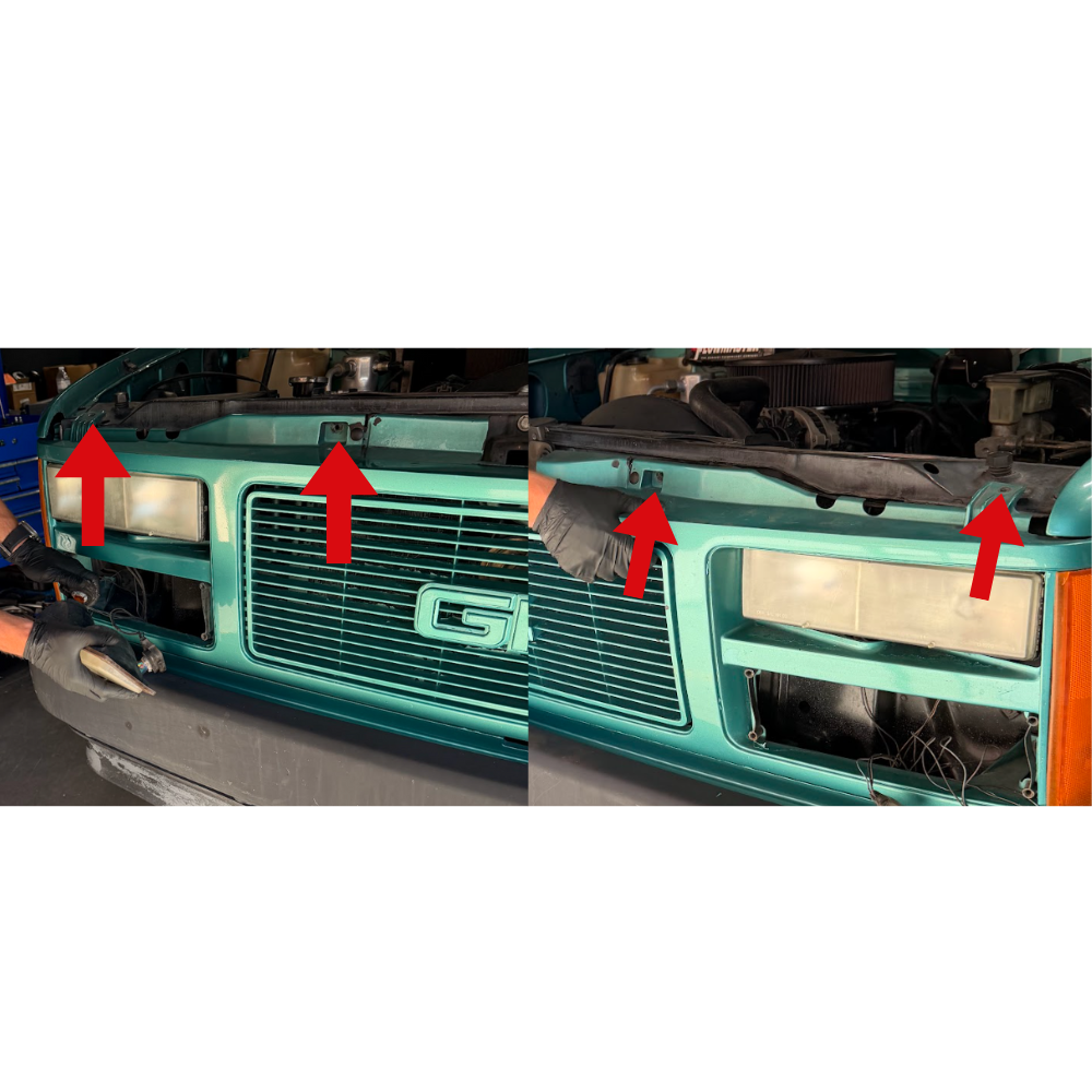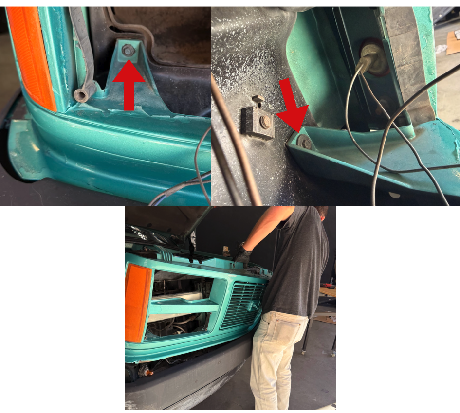 Remove the two 7mm bolts holding the grille assembly onto the vehicle. Then remove the entire grille assembly from the vehicle.