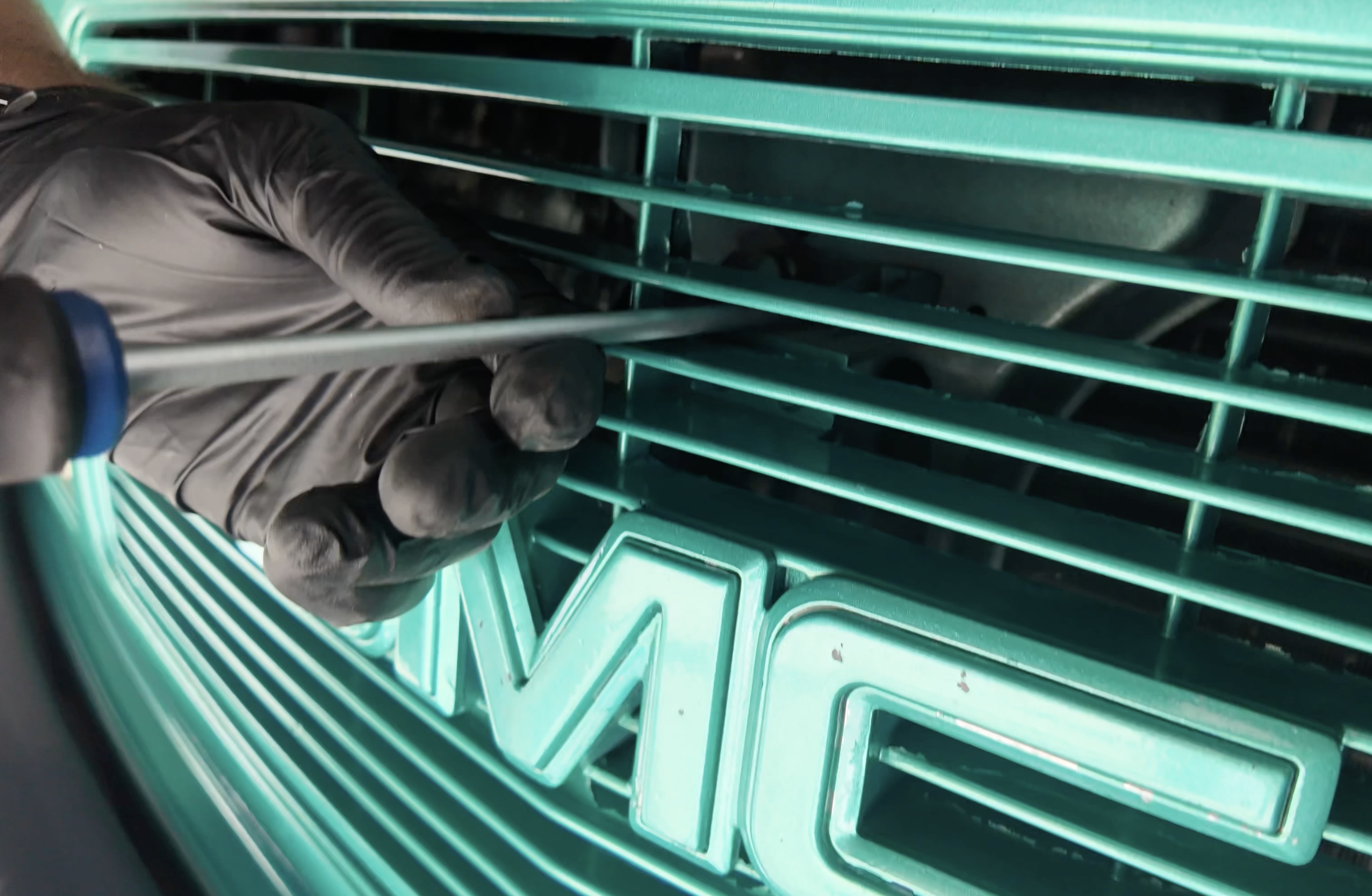 Remove the hidden 7mm bolt located above and behind the GMC grille badge.