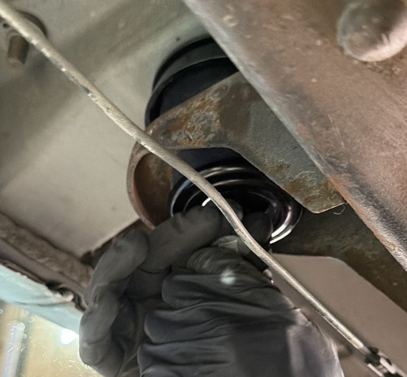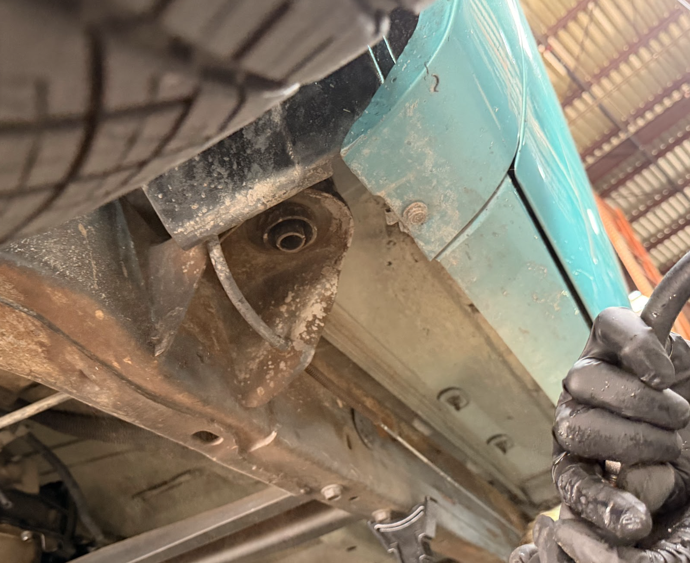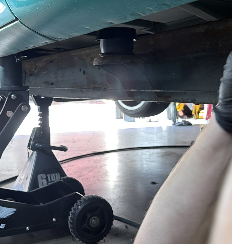 Now, using a floor jack with an extension, jack up the passenger side truck body enough to remove the old Upper Body Mounts (4 in total).