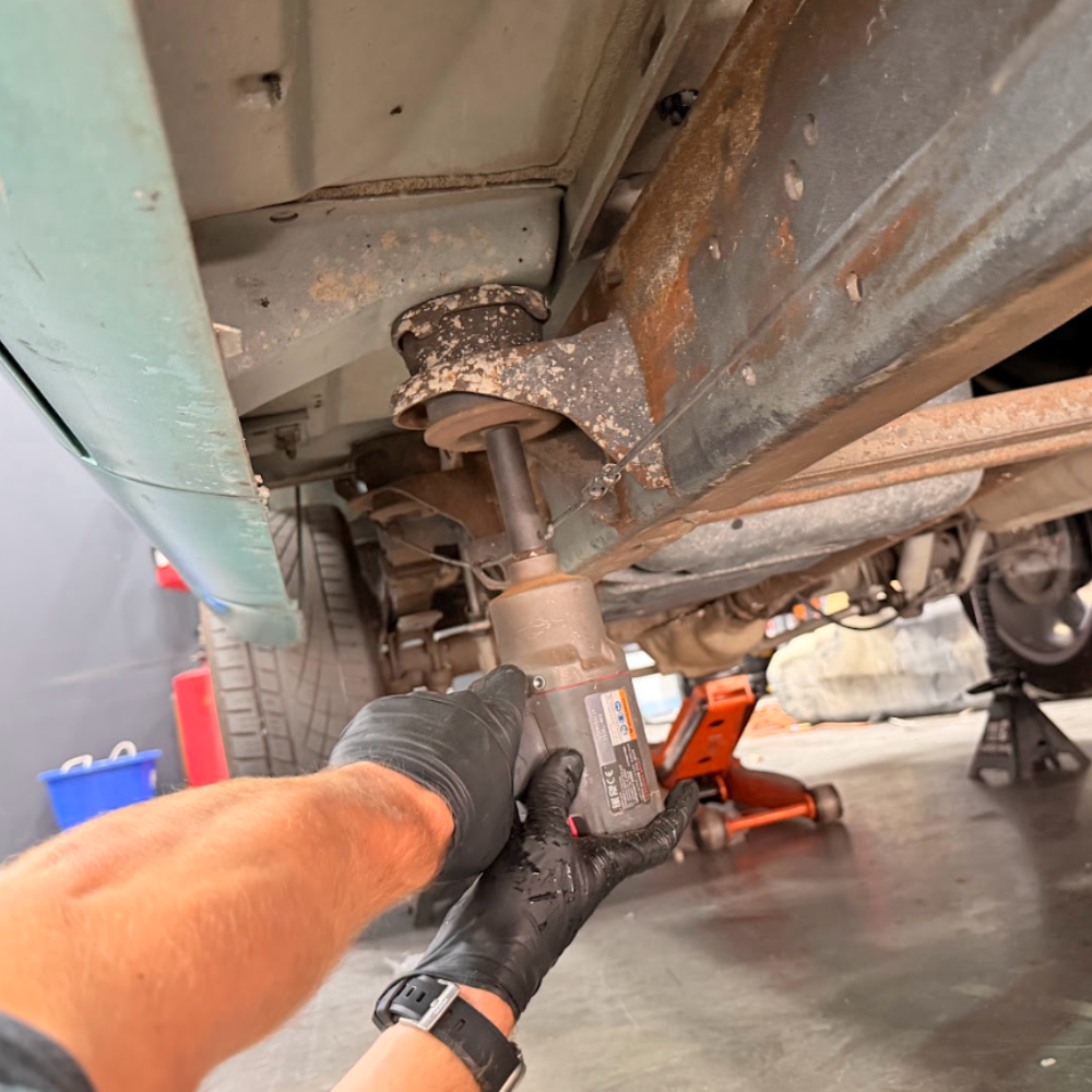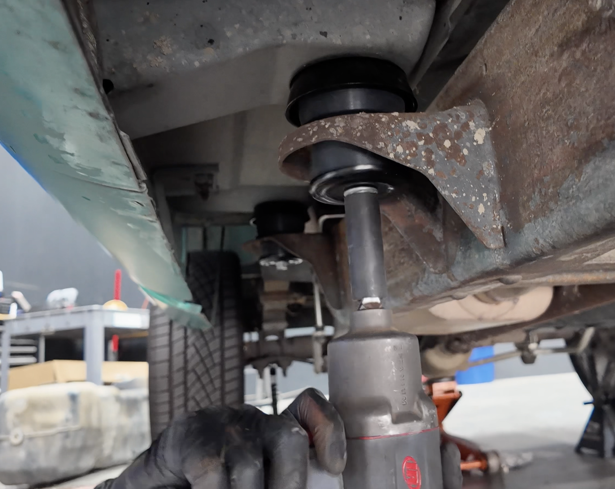 Now go ahead and move to the Passenger side and work your way down the line removing the lower section of Body Mounts. You'll need a 15mm socket for this step as well.