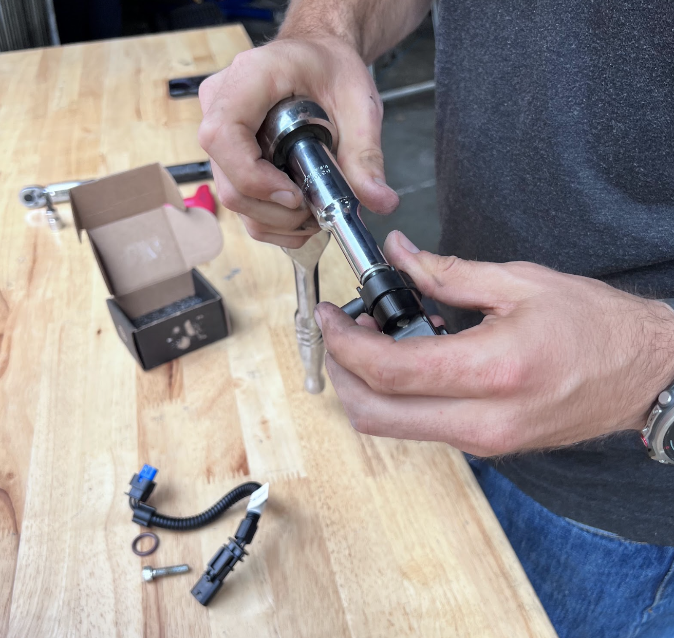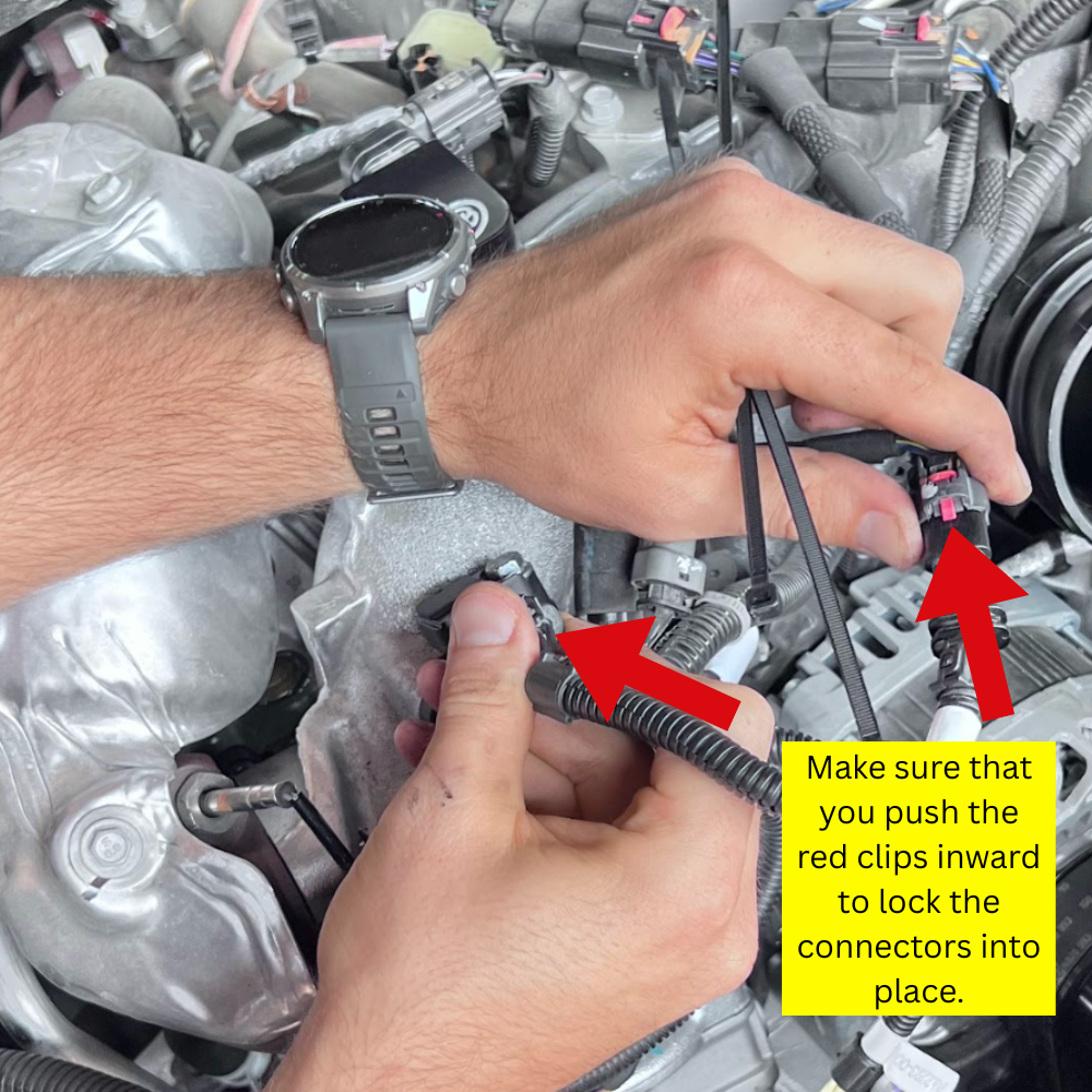 Next, go ahead and plug in the MAP Sensor to the OEM wire harness using the included extension harness within this kit. Once both ends are clicked in, make sure to push the small red tab on each end of the harness to lock it into place.