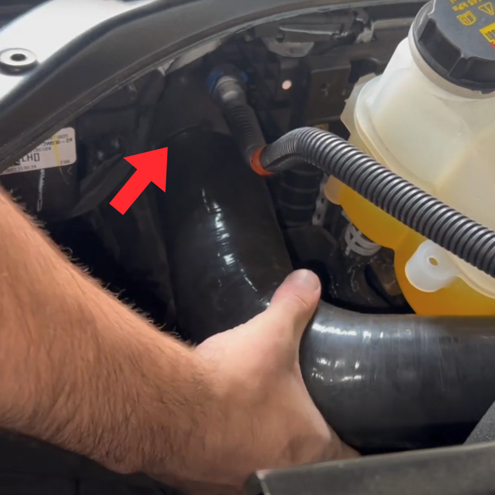 Using a 7mm socket, go ahead and remove the hose clamp at the intercooler outlet (located on drivers side, just under the core support). Then disconnect from the intercooler side.