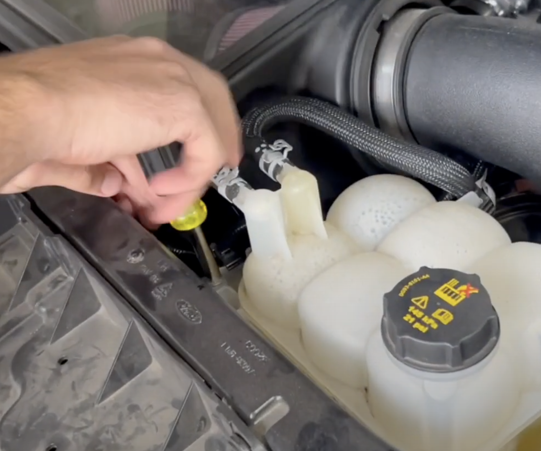 Using a 10mm socket, go ahead and remove the bolt on the cold side pipe bracket under the coolant reservoir.