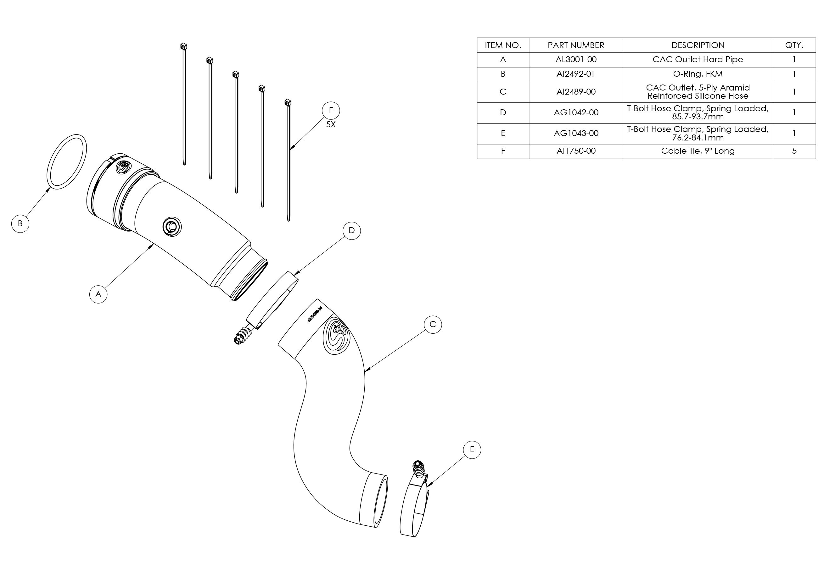 Verify that the CAC Silicone Hose (C) is up against the intercooler, with the intercooler outlet fully inserted, and the T-Bolt Hose Clamp (E) about 1/ 8” from the end of the Silicone Hose as shown below.