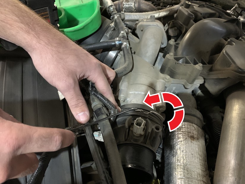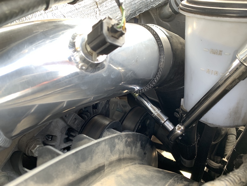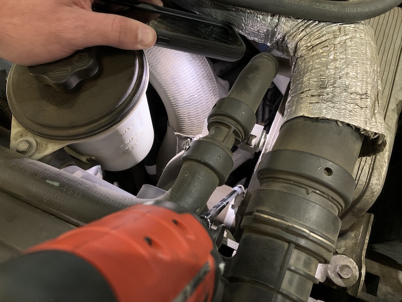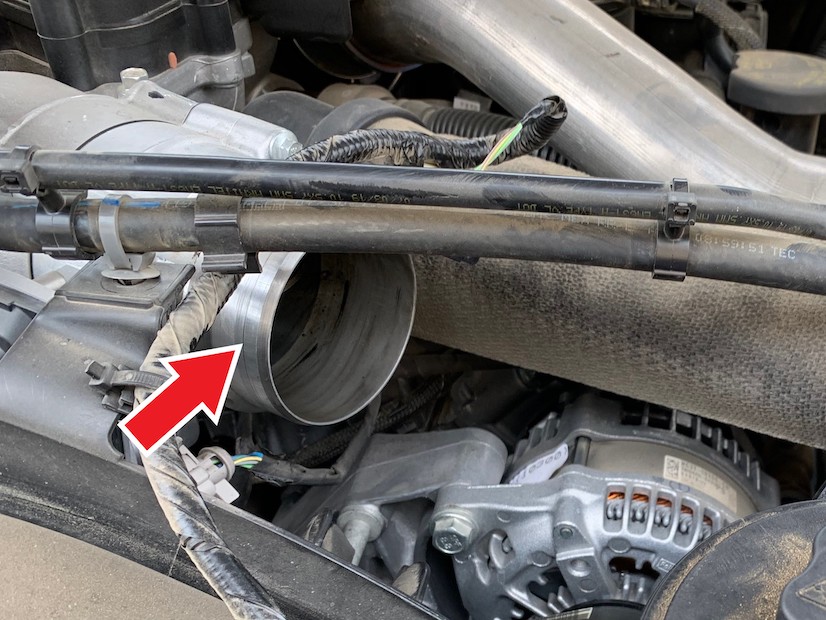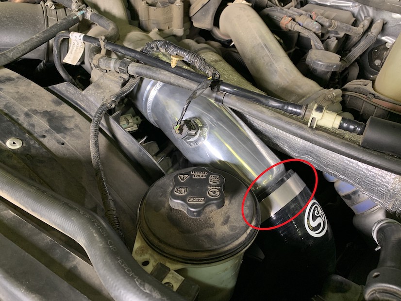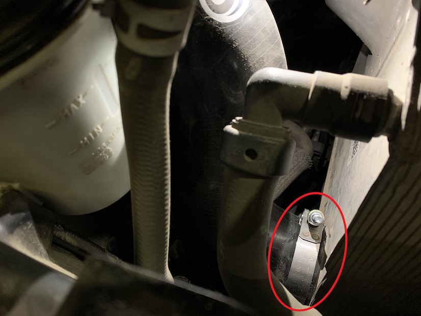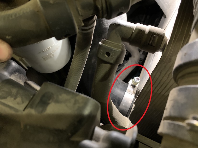 Loosen the upper hose clamp of the Charge Air Cooler (CAC) outlet hose.