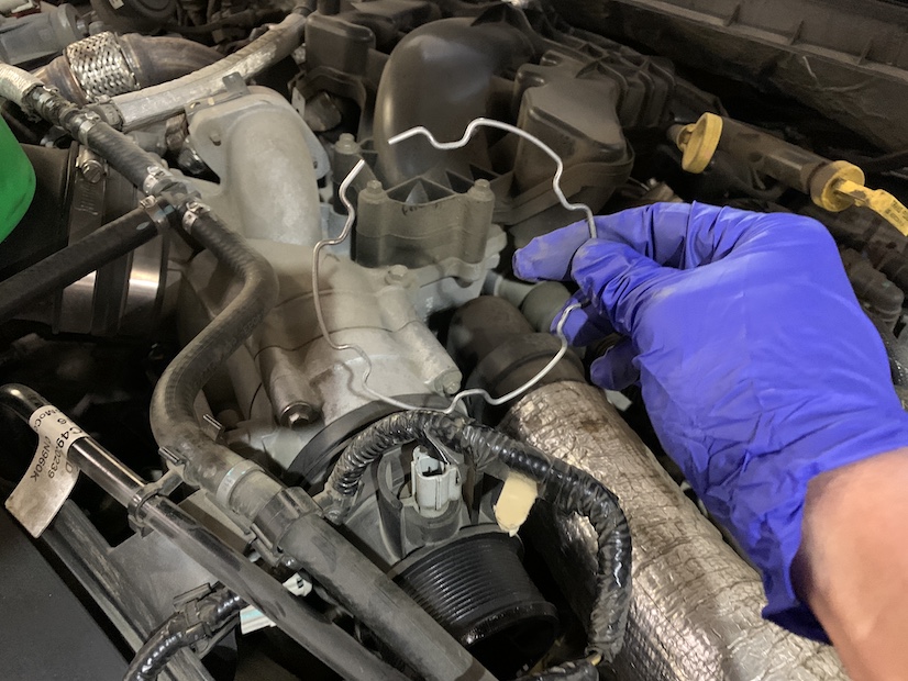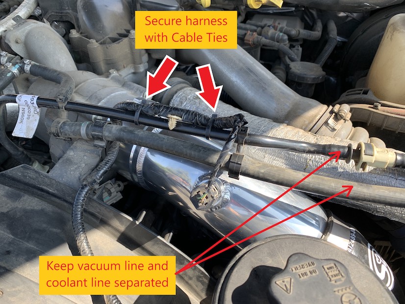 Secure the loose Temp Sensor harness with Cable Ties (F) to the plastic vacuum line as shown below. Cut off the excess cable tie with a Wire Cutter. Make sure to keep the plastic vacuum line and rubber coolant lines separated as it was from the factory to prevent them from rubbing on each other.