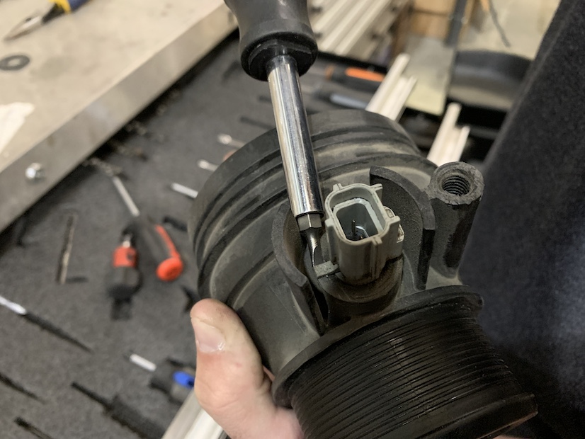 Using a Pick, carefully remove the Spring Clip from the plastic upper hose barb and set it behind the hose barb on the throttle assembly.