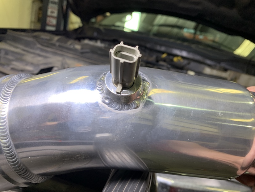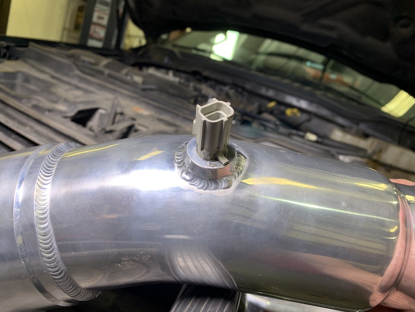 Insert the Temp Sensor into the CAC Hard Pipe (A) with the Temp Sensor tab resting on top of the boss and in front of the locking ramp as shown below.