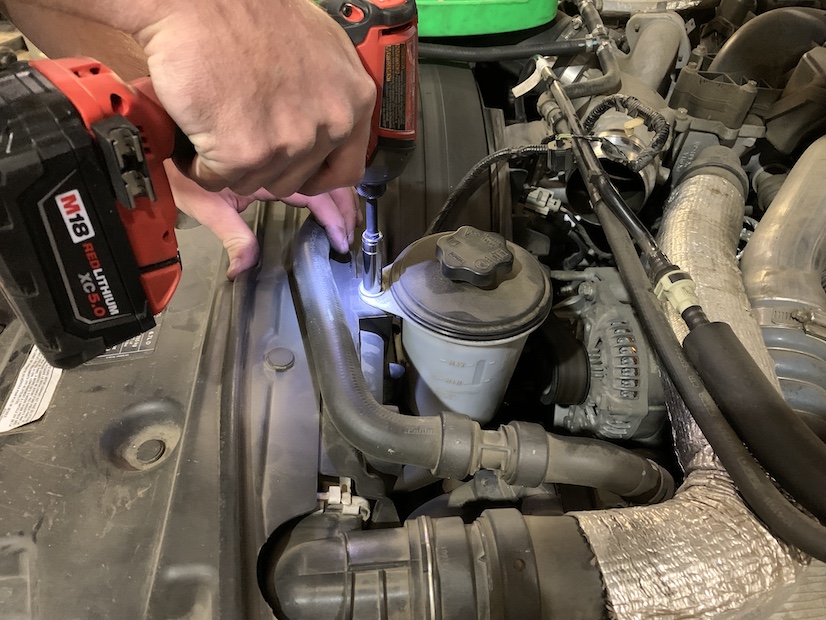 Remove the screw holding the power steering reservoir and set the screw aside.