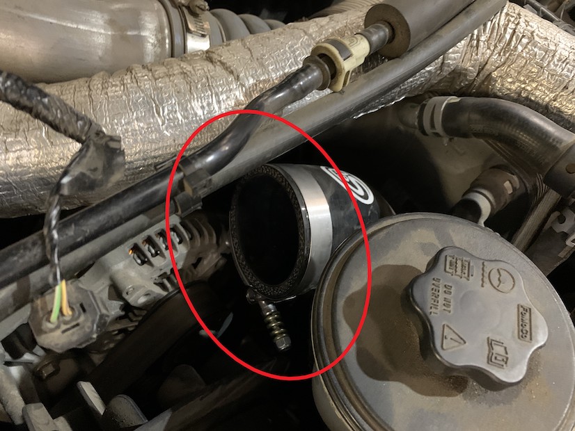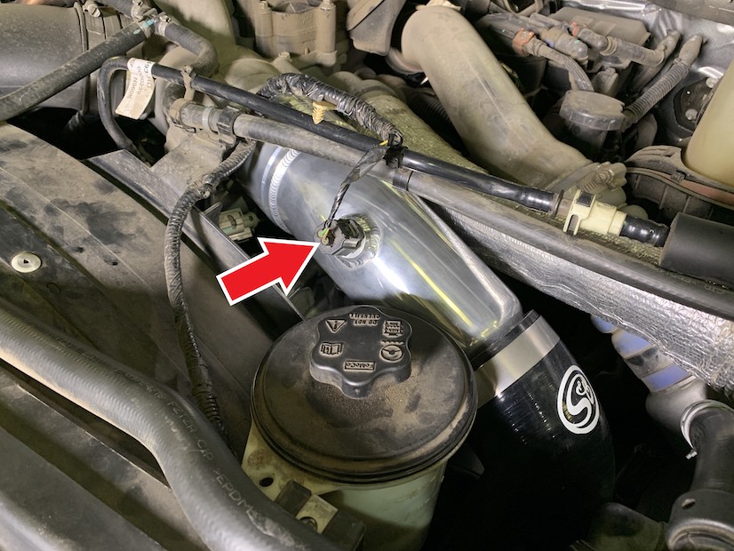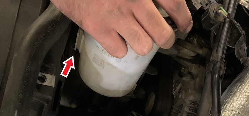 Lift the power steering reservoir from the support slot and carefully leave it off to the side while keeping it upright. This will give you more room when you install the CAC Silicone Hose (C).