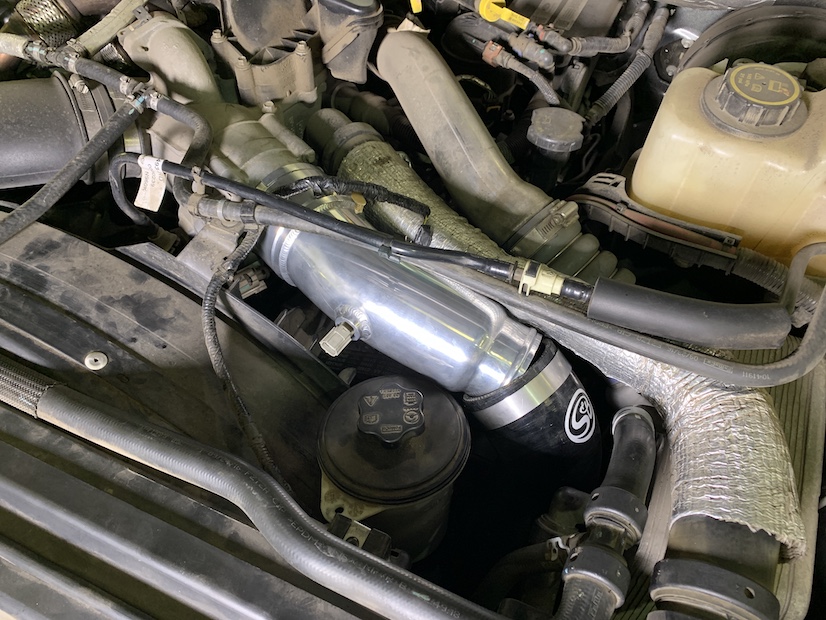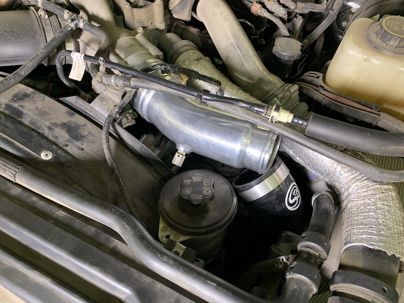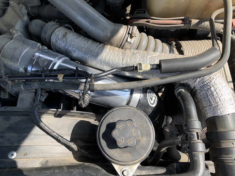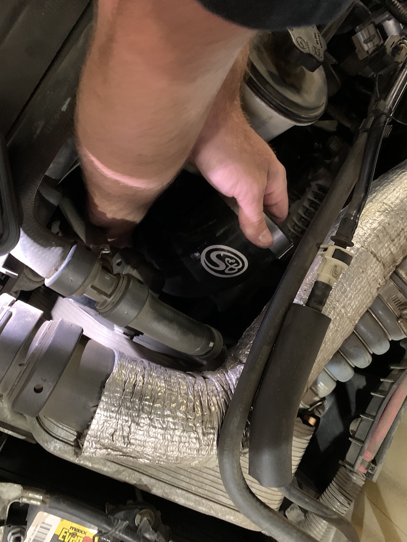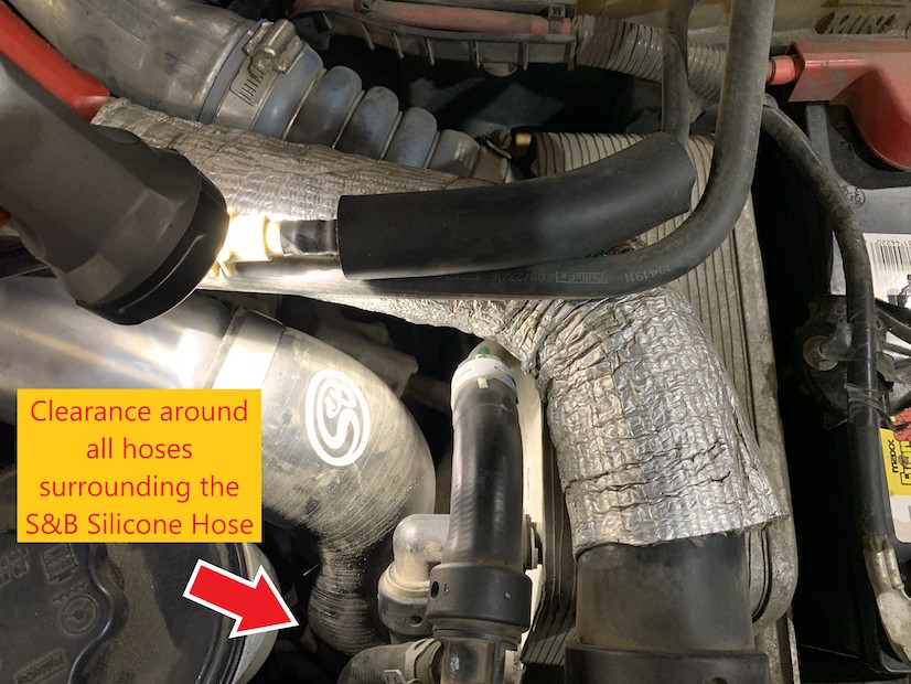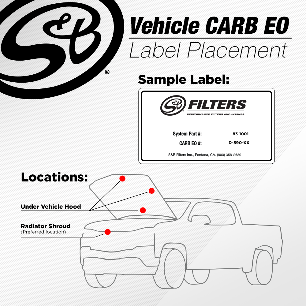 Please affix the included CARB-approved EO label in an area under the hood. We recommend placing it on the radiator shroud, or the underside of the vehicle's hood near the S&B product.