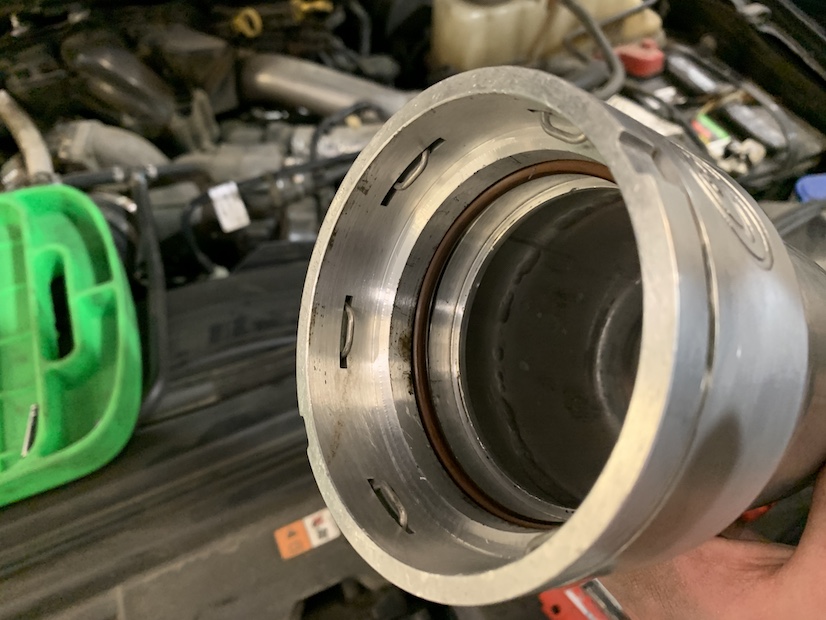 Stretch the O-Ring (B) by hand while adding a thin coat of clean diesel engine oil to the O-Ring. Work your way around the entire O-Ring, gently stretching and oiling it as you go. After stretching, verify that the outside diameter of the O-Ring touches all around the inside of the o-ring groove of the CAC Hard Pipe (A) as shown below. If the outside diameter of the O-Ring feels loose in the o-ring groove, gently stretch the O-Ring by hand again.