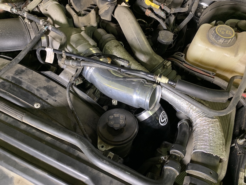 Clean and remove any residual oil on the Intercooler outlet and install the CAC Silicone Hose (C) with the T-Bolt Hose Clamps into the vehicle with the small end attaching to the Intercooler outlet. Leave the T-Bolt Hose Clamps loose at this time.