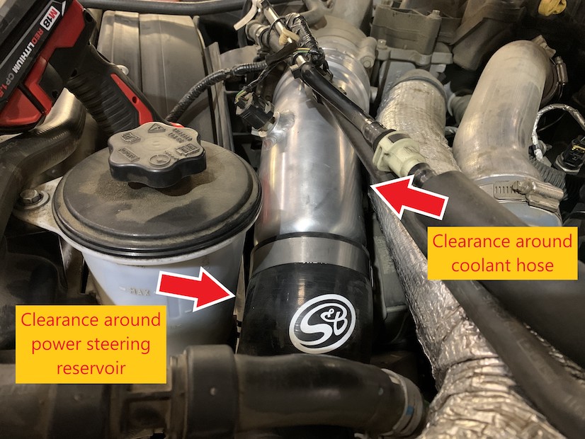 Temporarily put the power steering reservoir back in its support slot and check for clearances all around the CAC Hard Pipe (A) and CAC Silicone Hose (C). Rotate the CAC Hard Pipe to adjust the clearances making sure the CAC Hard Pipe and Silicone Hose are far enough away from the power steering reservoir and other surrounding lines and hoses.