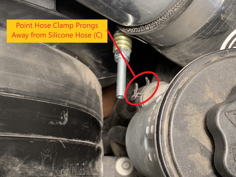 Rotate the power steering reservoir spring band hose clamp so that the prongs are pointing away from the Silicone Hose (C).
