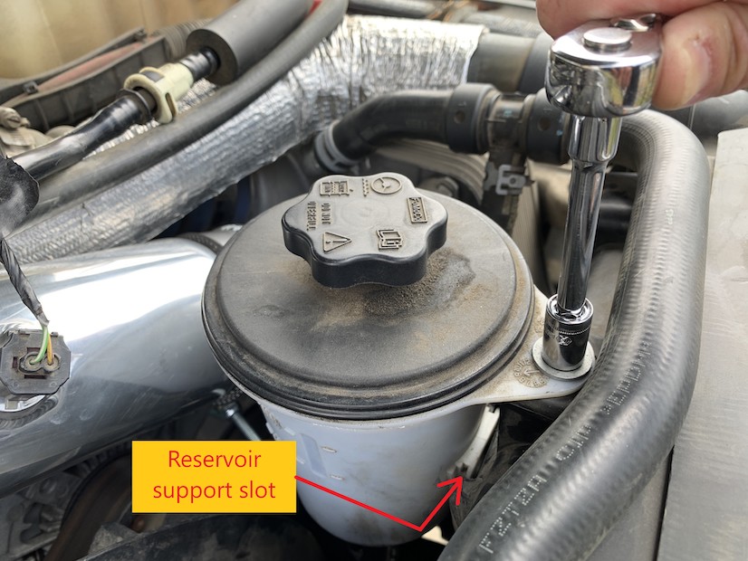 Place the power steering reservoir back in the support slot and tighten the screw.