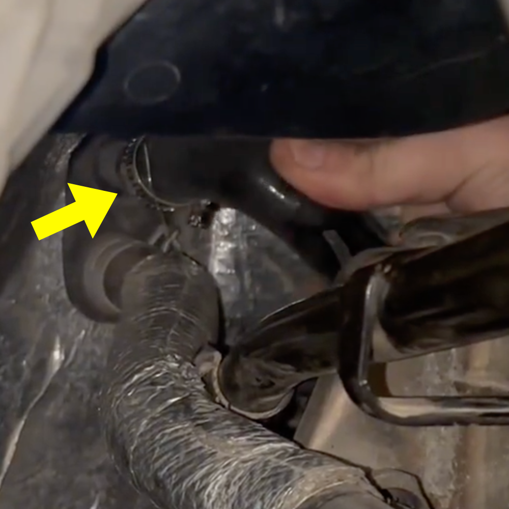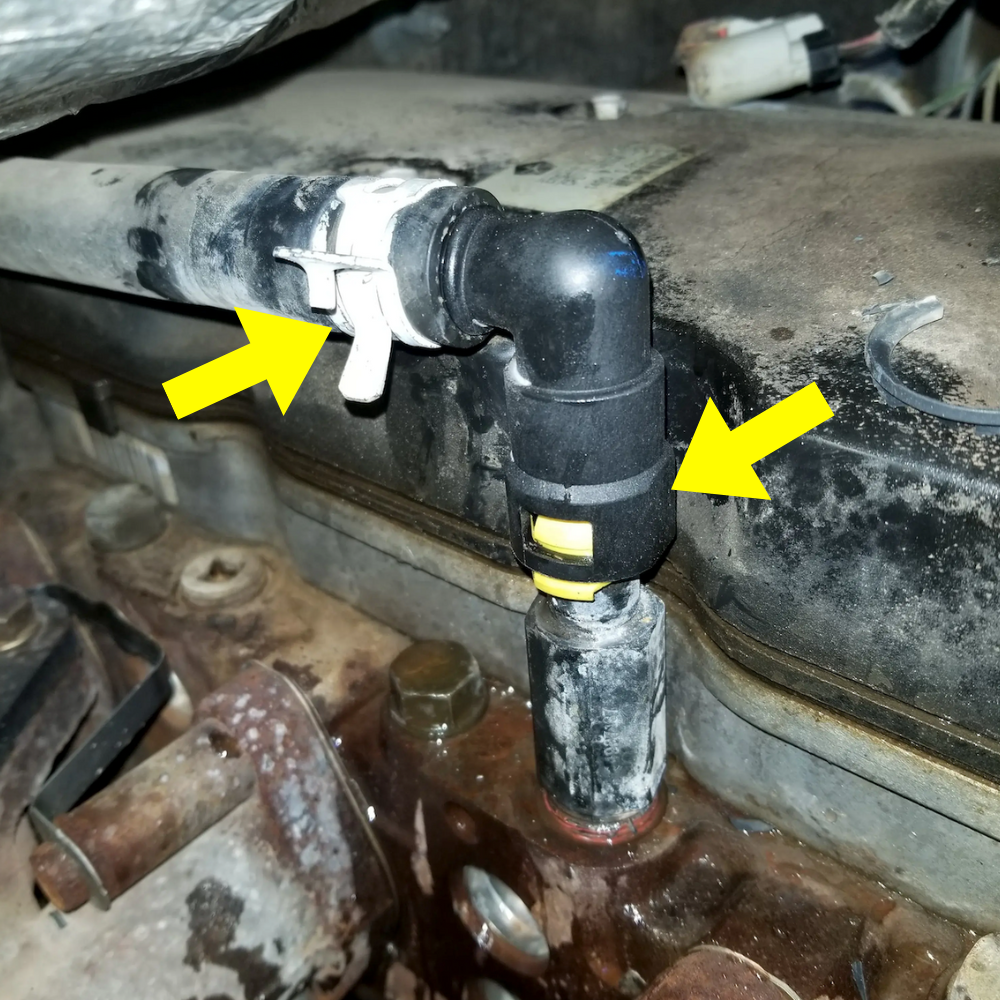 Disconnect the fitting located on the firewall behind the EGR cooler. We recommend using needle nose pliers or vise grips.