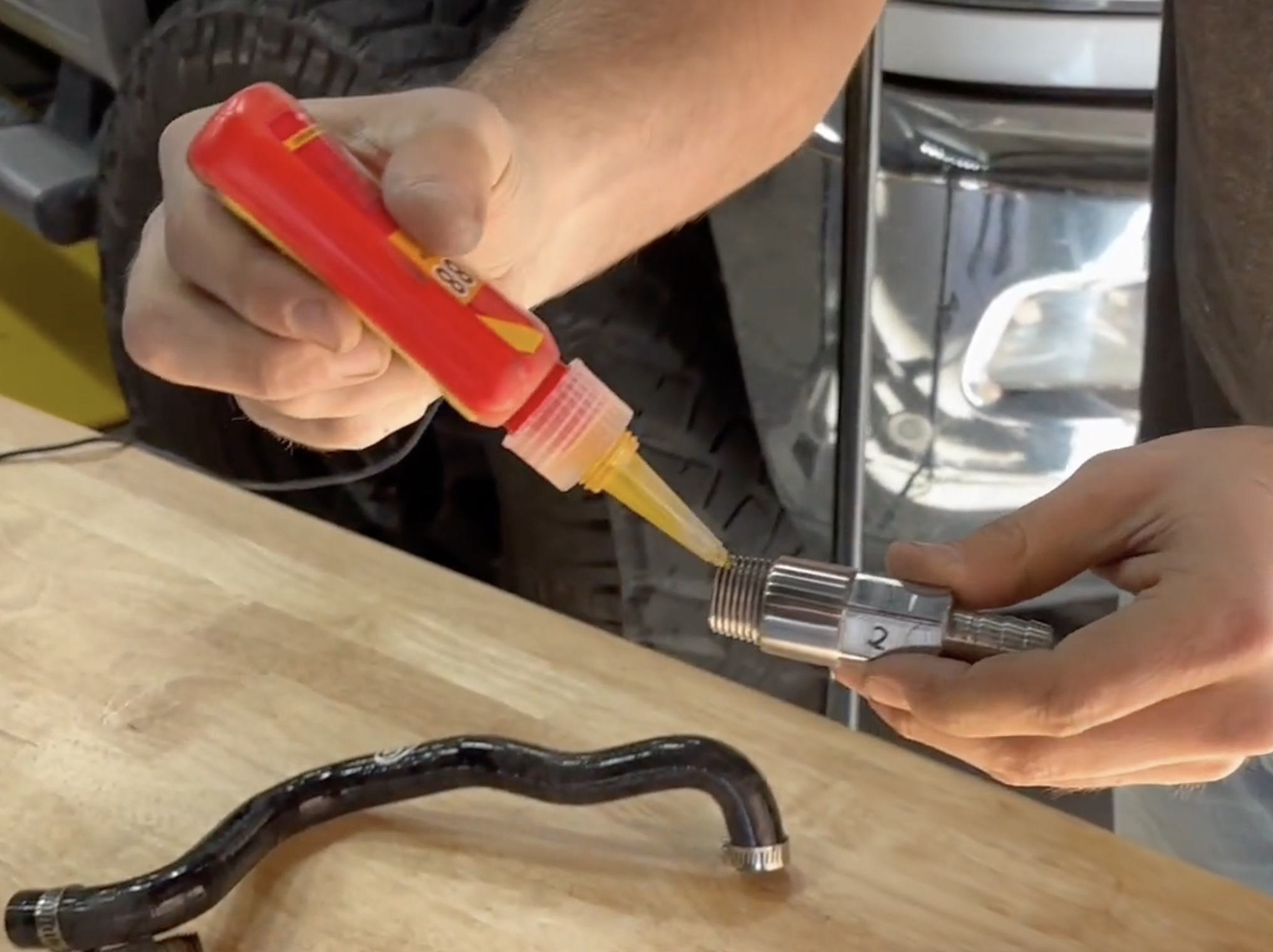 First, start by putting a bead of thread sealant on the S&B fitting.