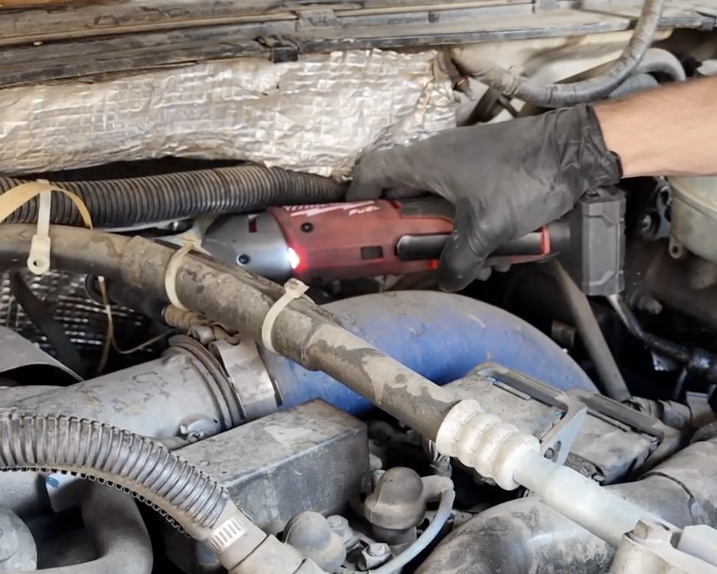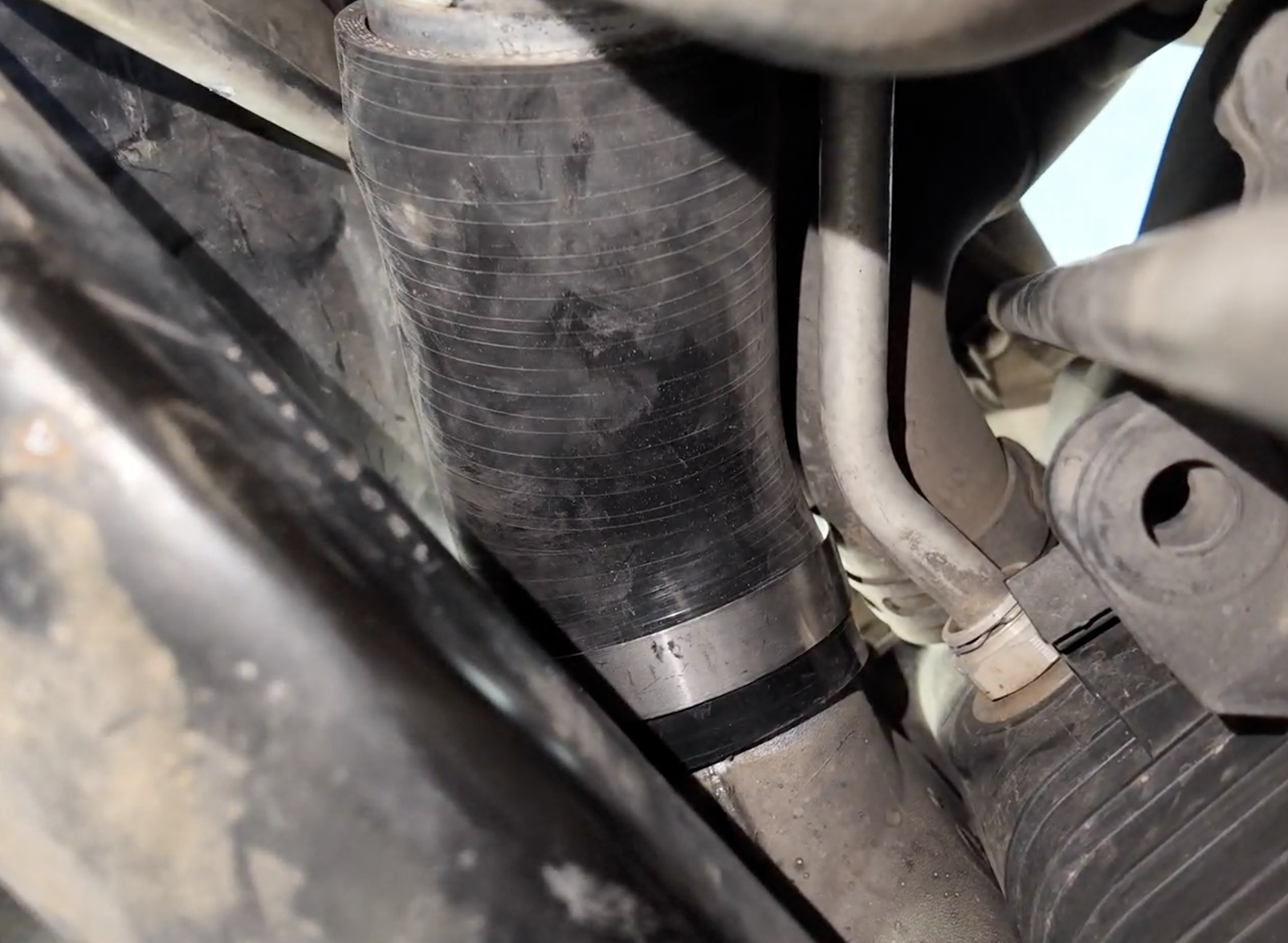 Move to the Hot Side Intercooler Pipe (Driver Side). Start by removing the stock upper hot side intercooler boot using an 11mm deep socket to remove the two stock clamps.