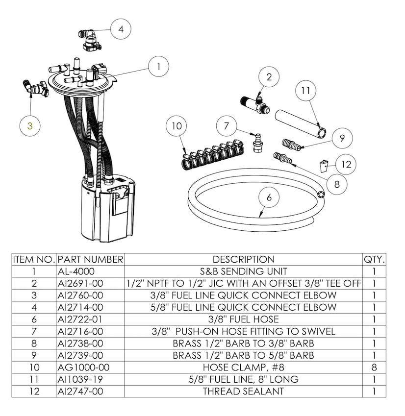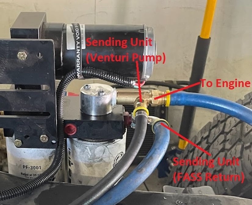 Begin by following S&B Tank instructions to drop the tank and remove the sending unit. Also, follow your lift pump installation instructions but DO NOT MODIFY your stock sending unit. WARNING: The S&B Sending Unit is optimized for aftermarket lift pumps set to 65 PSI, do NOT exceed 70 psi on your lift pump!