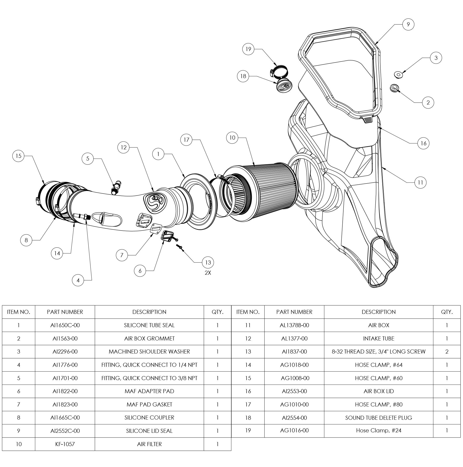 Prepare the JLT intake tube for installation by connecting all of the components shown in the picture to the intake tube. These components include the ¼ NPT quick connect (4), ⅜ NPT quick connect (5), silicone coupler (8), MAF sensor, MAF sensor pad (6) and MAF sensor gasket (7). Hand tighten quick connect fittings and then use a crescent wrench and tighten it another one to two complete turns. Secure the silicone coupler to the tube using the #64 hose clamp (14) and tighten the #60 hose clamp (15) around the other end of the coupler so that the hose clamp remains somewhat loose but doesn’t fall off.