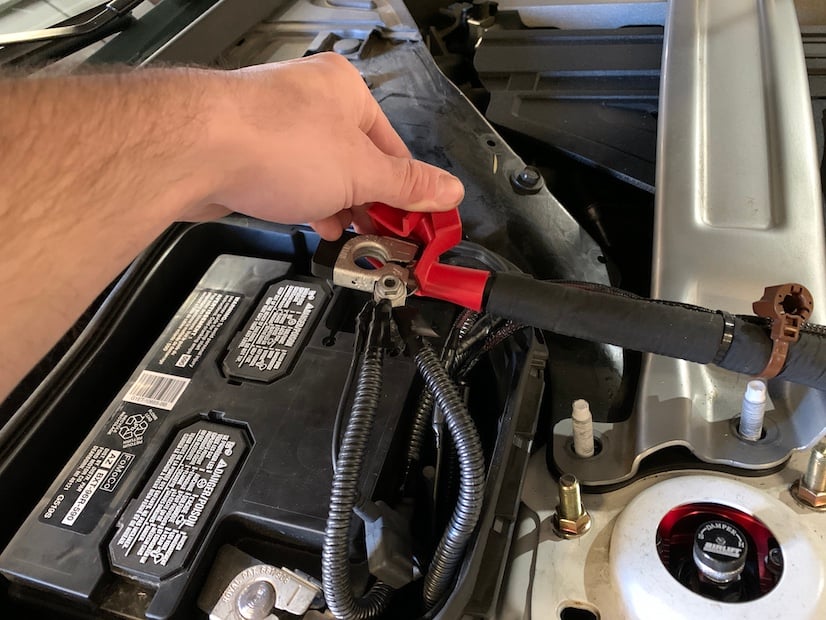 With the ignition switched off and the parking brake set, disconnect the Positive battery harness on the battery. The battery must be disconnected for at least 2 hours to ensure proper functionality of the kit during use. Be sure to cover the end of the harness for the rest of the installation process so that it does not touch any part of the vehicle that acts as a ground point.