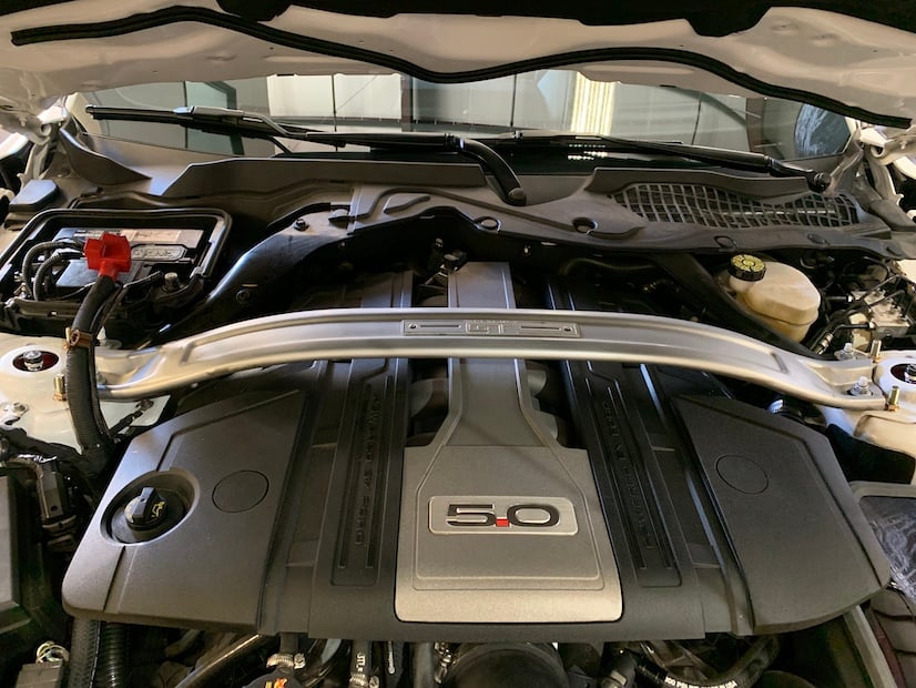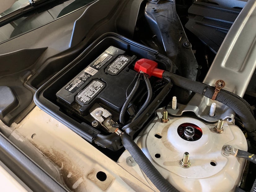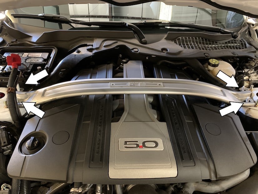 Remove the 4 nuts securing the strut tower brace to the engine bay. Then remove the strut tower brace by lifting up, avoiding the positive battery harness.