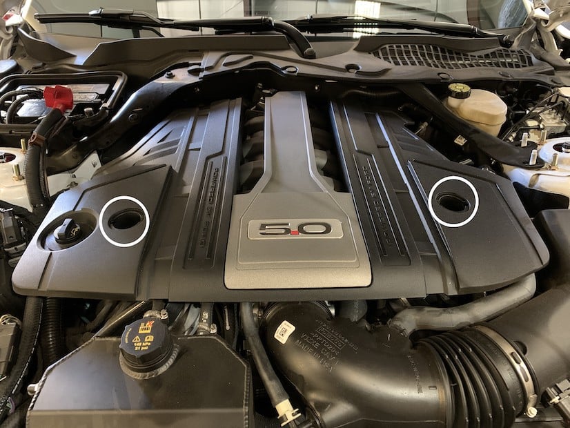 Remove the two covers shown and unscrew the nuts found below them to prepare for the removal of the engine cover. Lift up on the engine cover, popping it off of the top of the engine to gain access to the entire intake system.