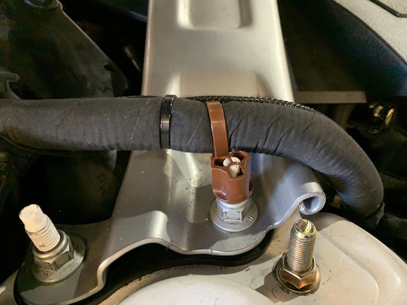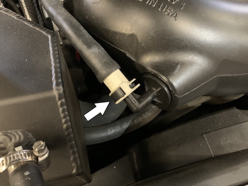 Disconnect the PCV hose from the stock intake tube by pressing in the indicated tab and pulling out.