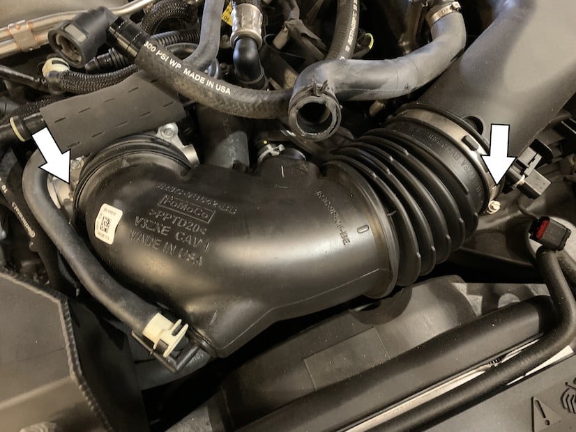 Loosen the hose clamps found on both ends of the stock intake tube. Remove the tube from the vehicle.