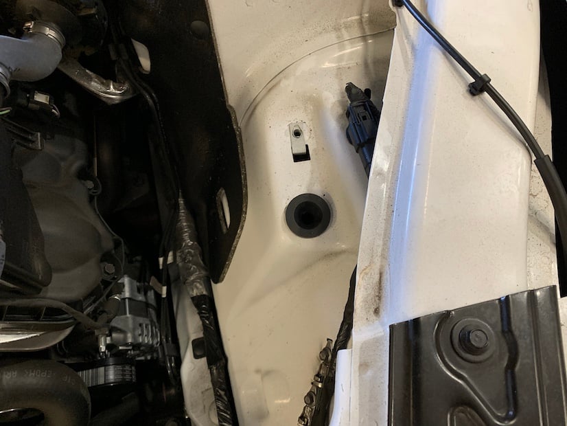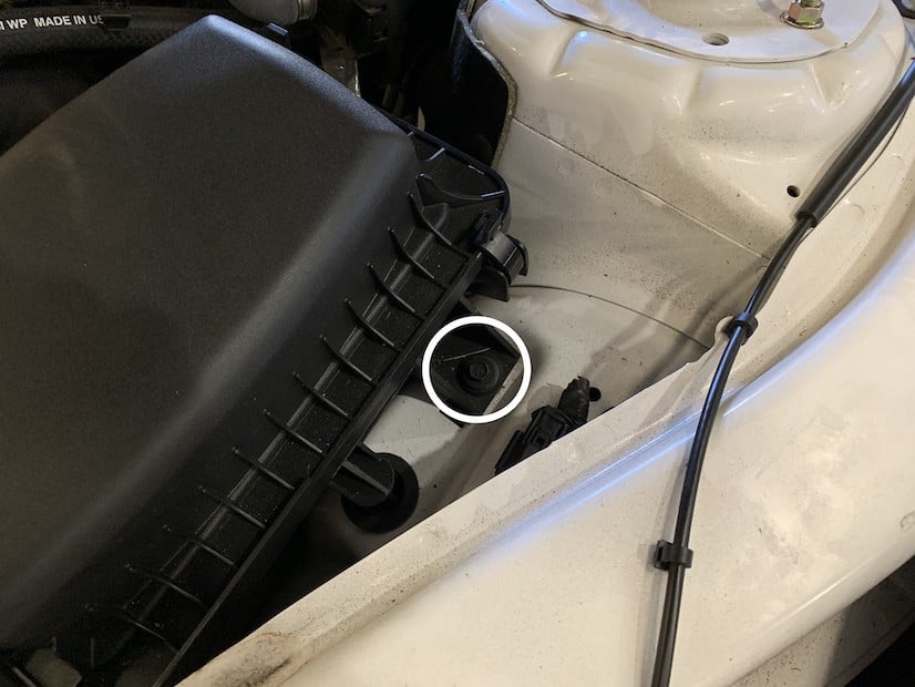Verify that the grommet pictured did not come out of its hole on the vehicle with the stock intake box. If it did, remove it from the intake box and return it to its hole on the vehicle.