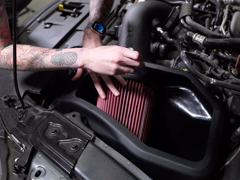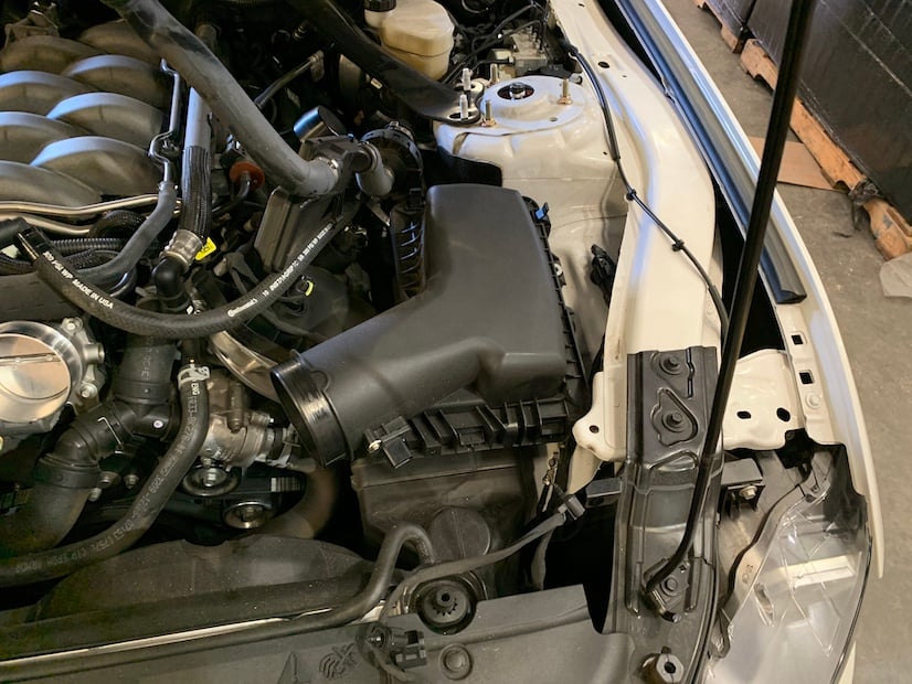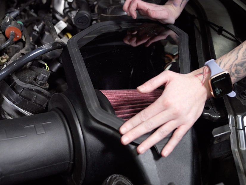 Remove the stock intake box from the vehicle by lifting it up and out.
