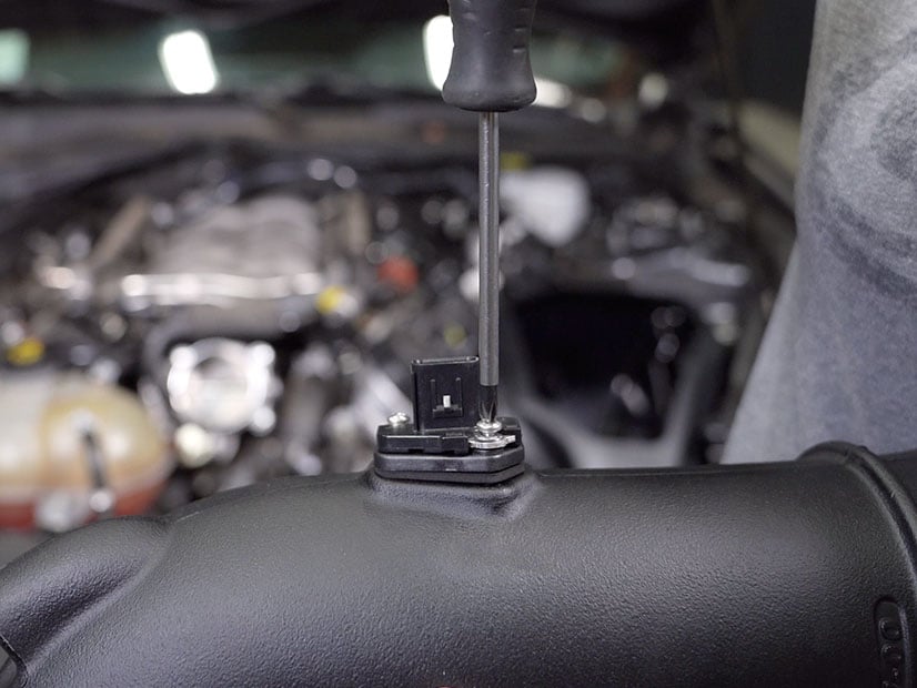 Attach the MAF sensor to the JLT intake tube using the provided MAF gasket, MAF adapter pad and philips head screws (13). The MAF gasket should be contacting the tube with the adapter, pad followed by the MAF sensor, sitting on top of it.