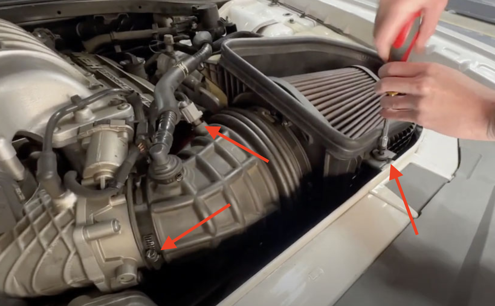 Remove the screw holding the airbox to the car, disconnect the IAT sensor, and loosen the hose clamp connecting the stock intake to the throttle body.
