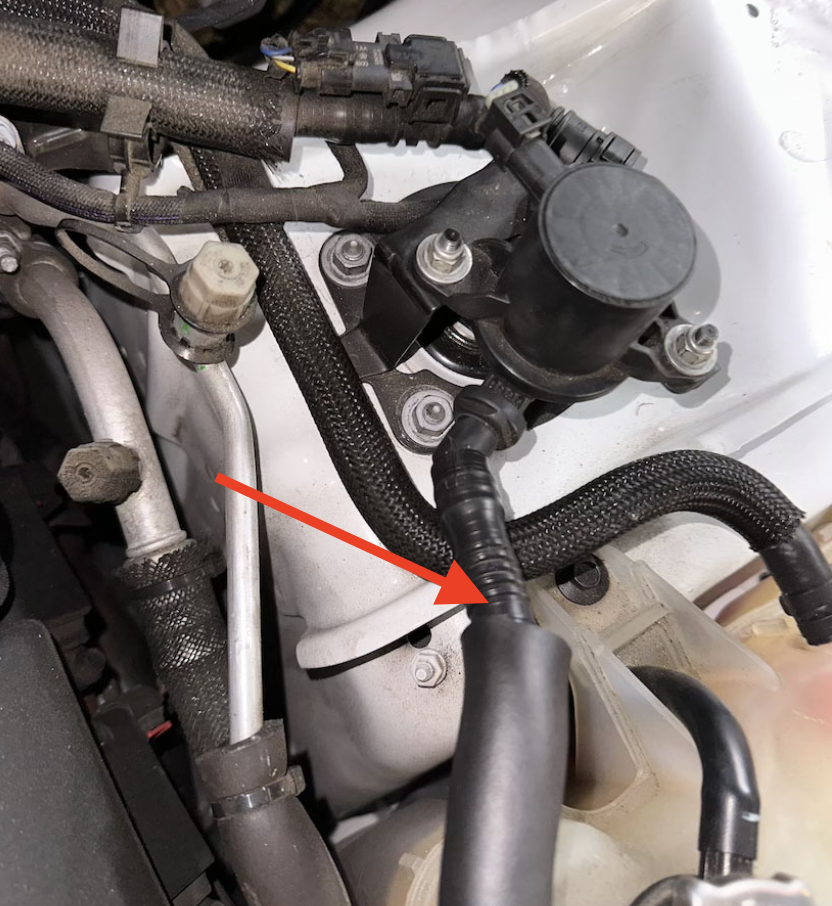 Unfasten the two screws holding the coolant tank to allow for more room when removing the stock intake and installing the JLT intake.