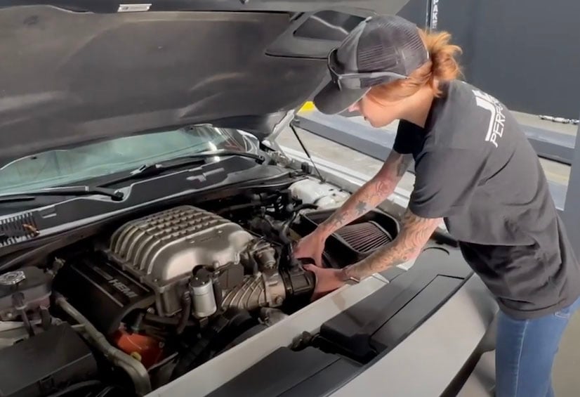 Remove the stock intake system from the vehicle. For Challengers, remove the headlight scoop connected to the air box. For Chargers, the stock headlight scoop will be reused so it can remain in place by pinching the end of the tube so it unsnaps from the box.